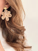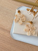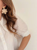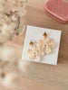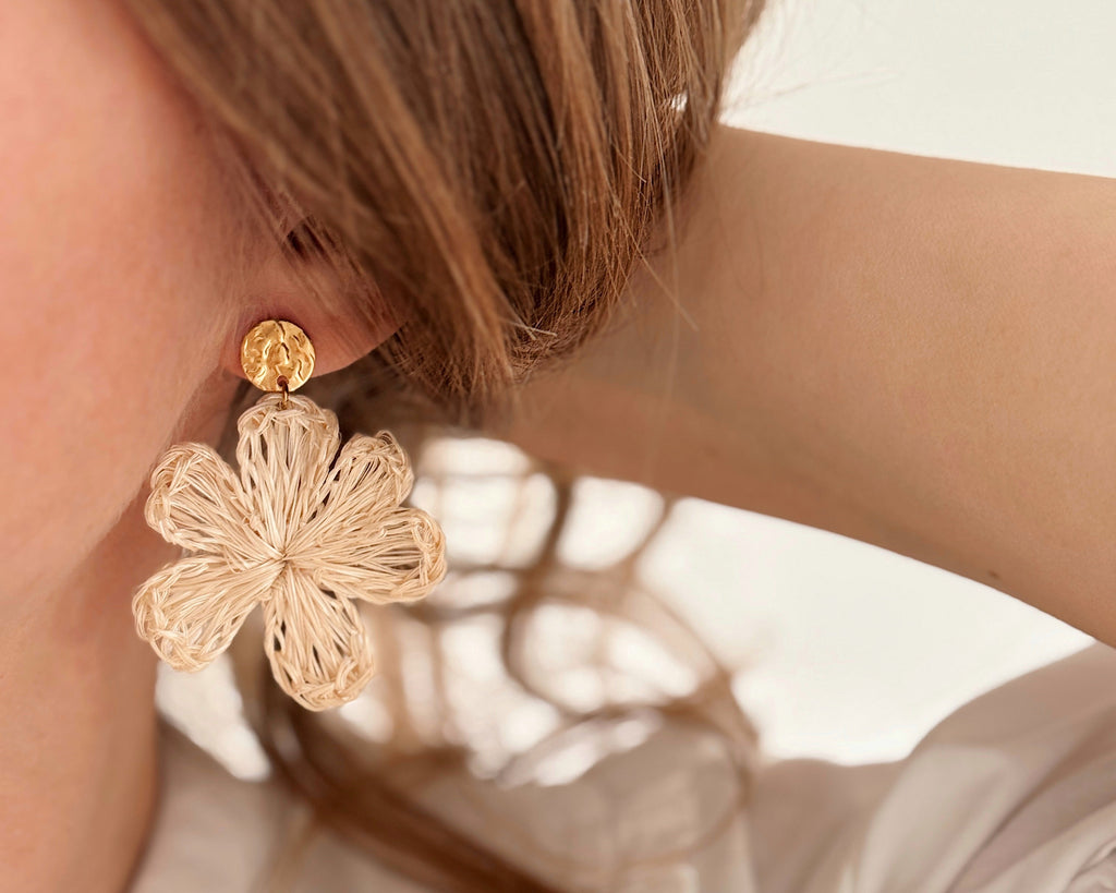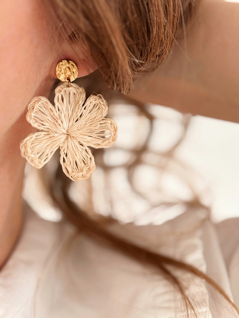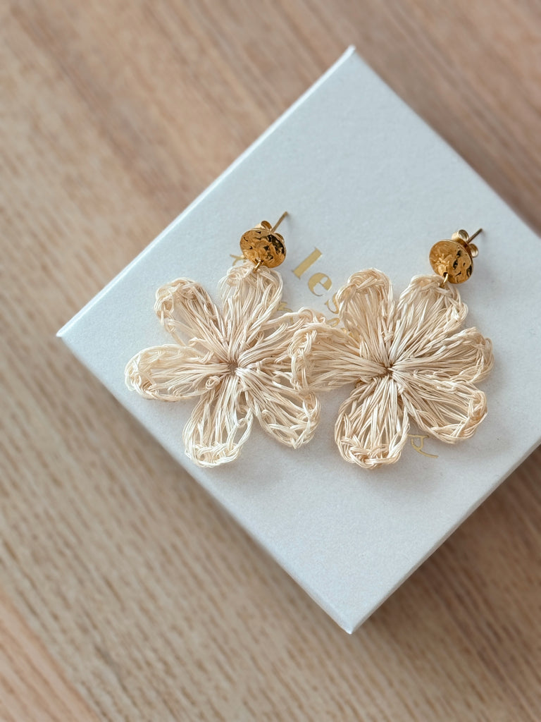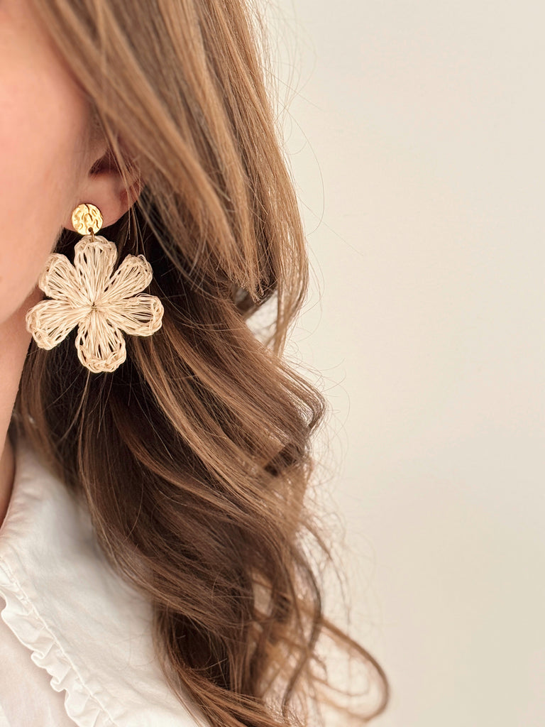 Boucles d'oreilles avec puces d'oreille dorées et martelées de 1cm de diamètre et pendentifs en rotin naturel ivoire.