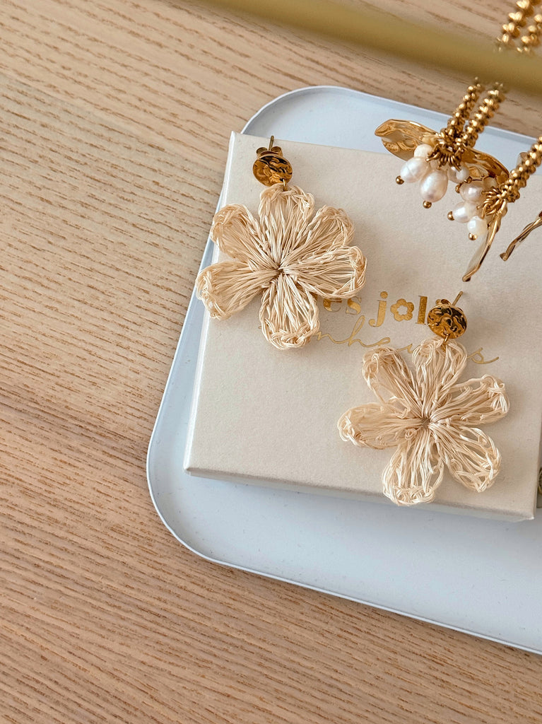 Bijou imaginé et assemblé à la main dans mon atelier bordelais en acier inoxydable doré sans plomb, sans nickel et sans cadmium et rotin naturel ivoire tressé à la main. Livré avec son écrin Les Jolis Bonheurs.