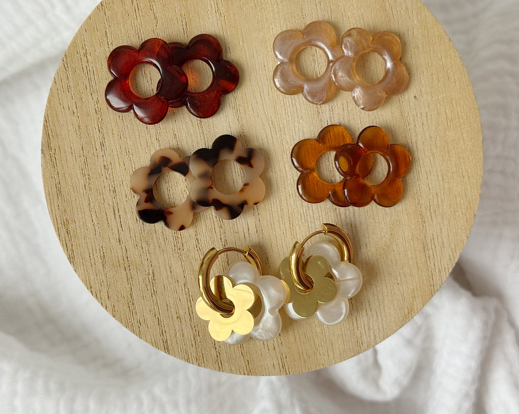 Pack disponible avec la paire de créole et les fleurs dorées, ou sans (dans ce cas vous recevrez uniquement les 5 paires de pendentifs fleur en acétate).