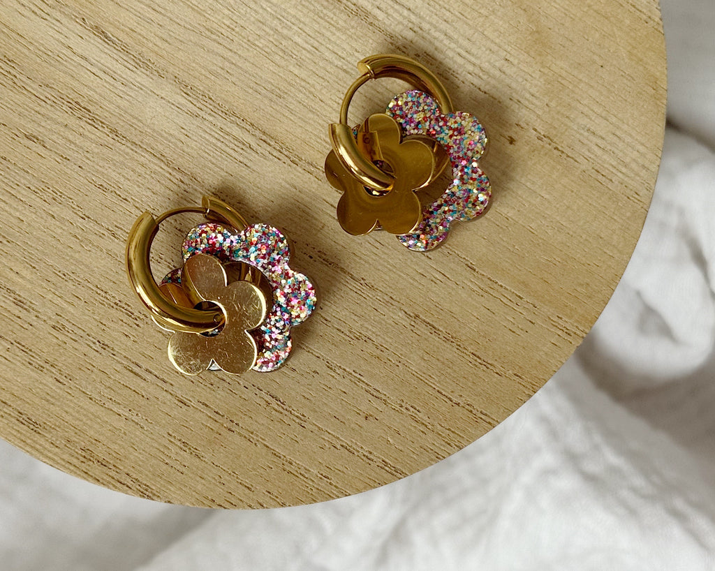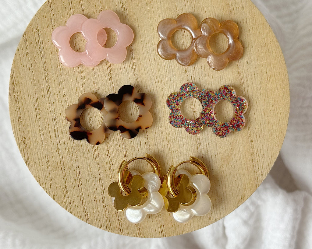 Pack disponible avec la paire de créole et les fleurs dorées, ou sans (dans ce cas vous recevrez uniquement les 5 paires de pendentifs fleur en acétate).