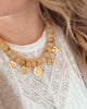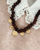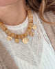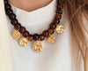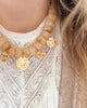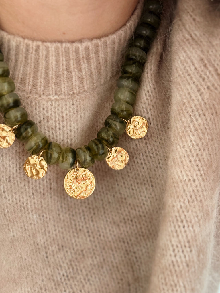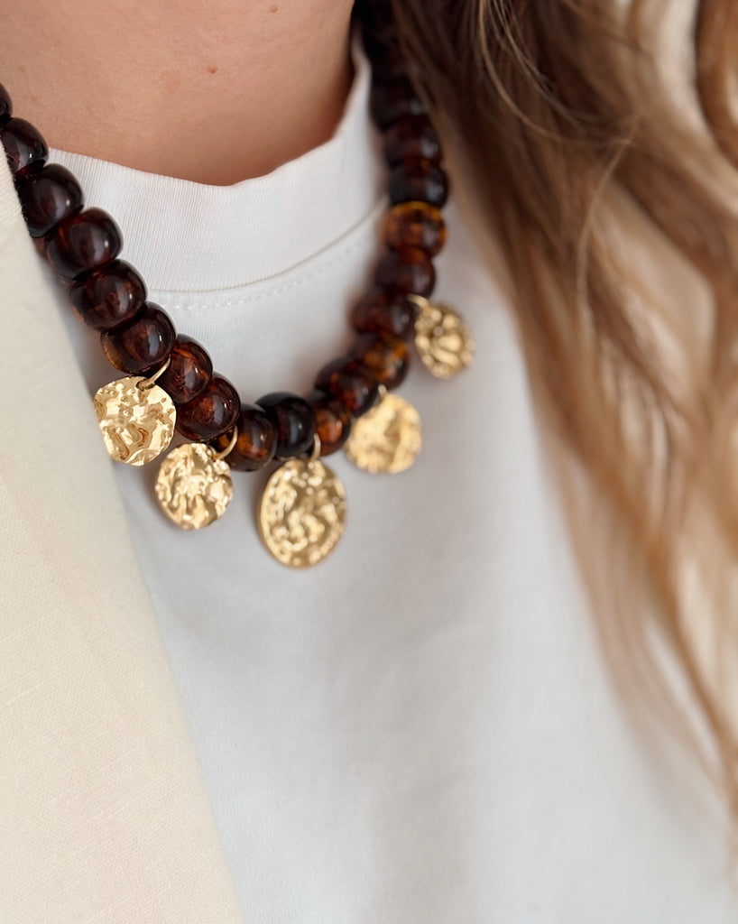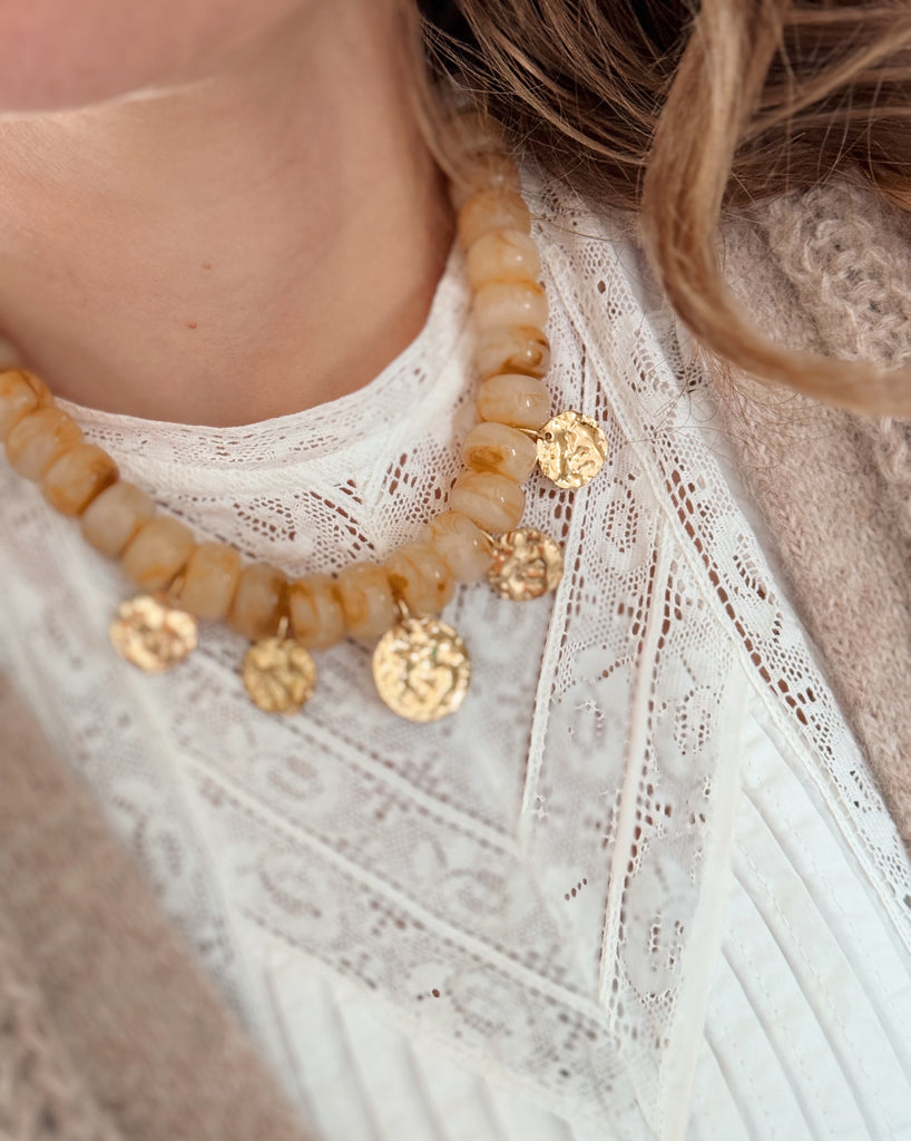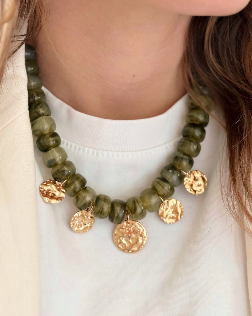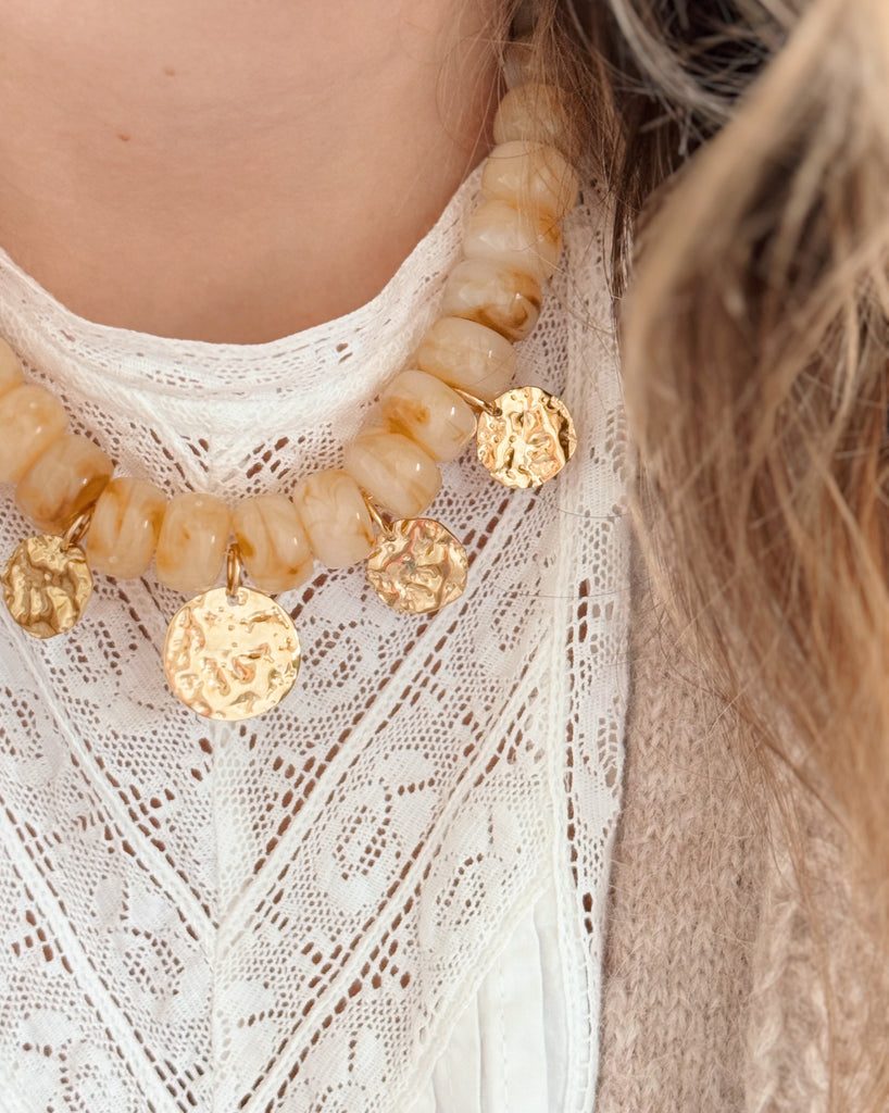 Collier ajustable de 40/45cm avec chaine fine ornée de perles rondelles en acétate marbrées translucides et de 5 médailles dorées de différentes tailles.