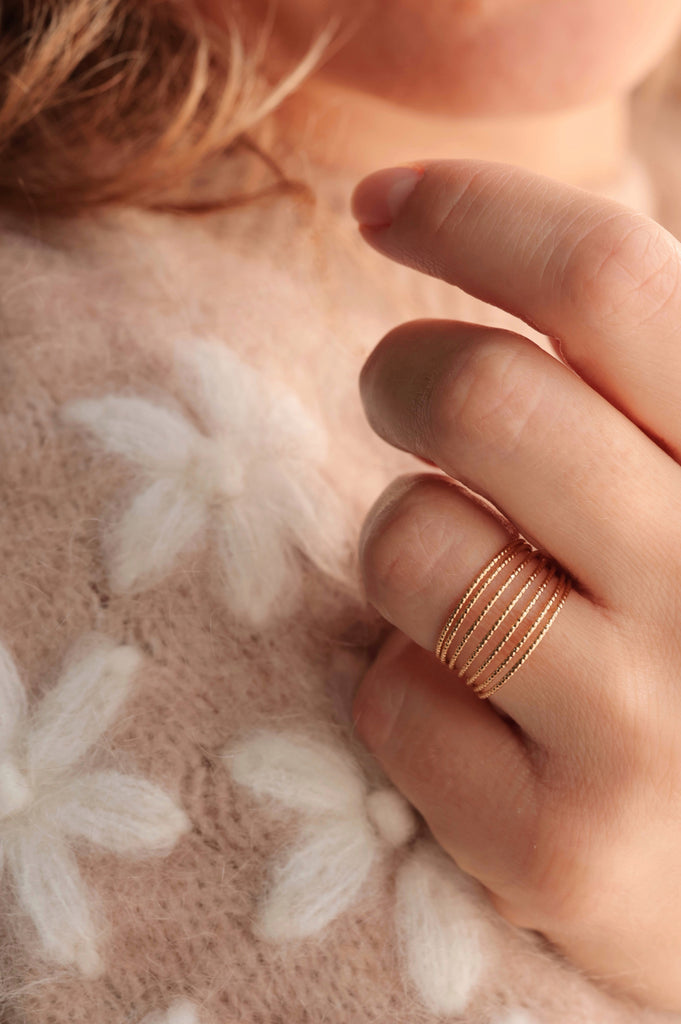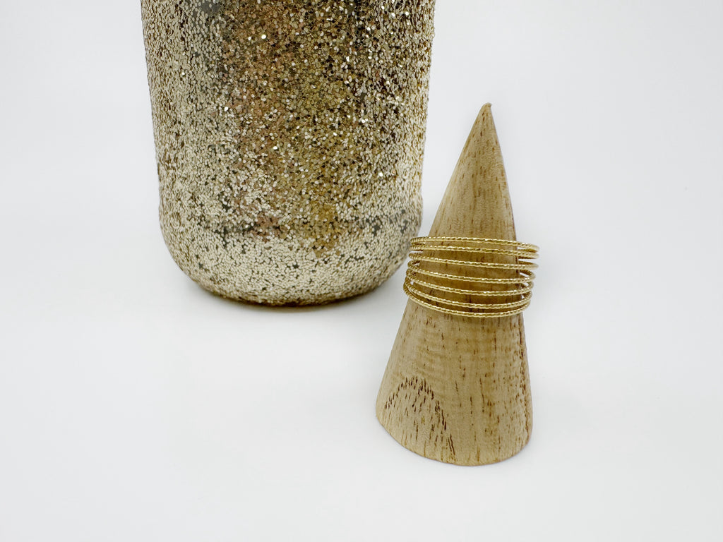 Bague en plaqué or à taille ajustable, adaptée à partir de la taille 53, composée de 7 joncs fins et martelés.