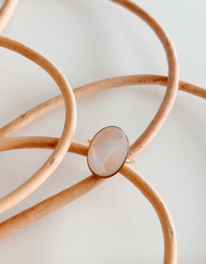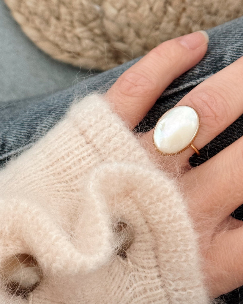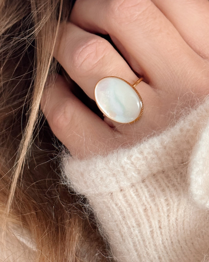 Bague à taille ajustable à partir de la taille 54 avec cabochon en nacre blanche naturelle de 13 mm x 18 mm.