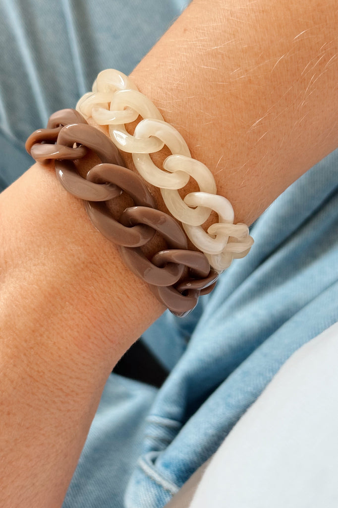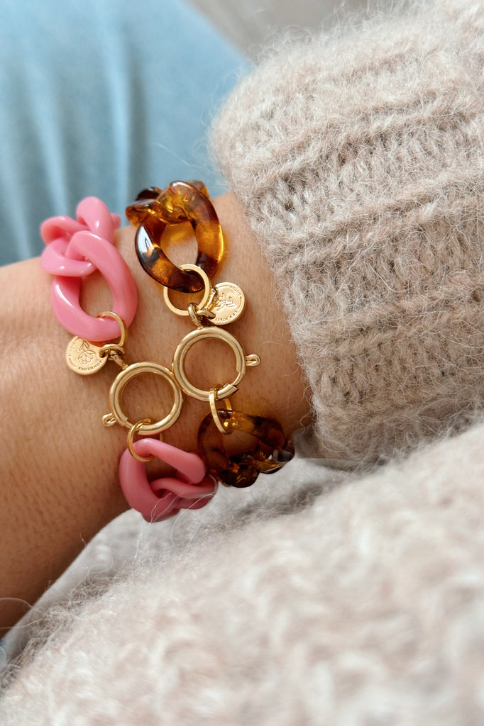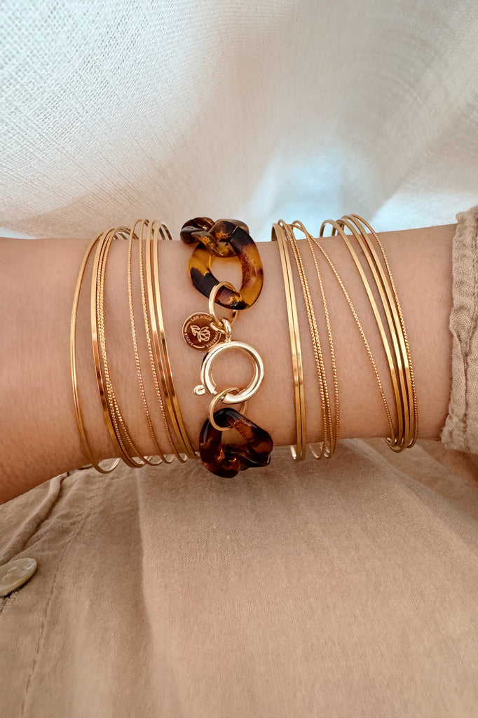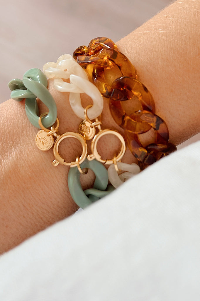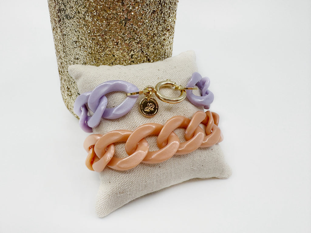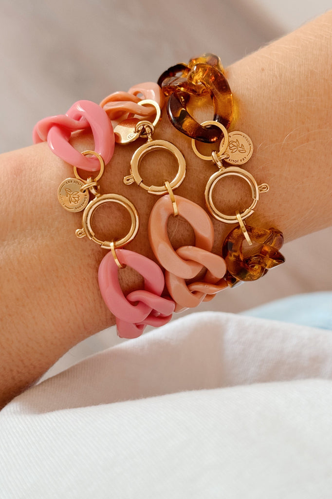 Bracelet composé de maillons en acétate de 16mm x 23mm (12 mm x 18mm pour le coloris ivoire), fermé avec fermoir en laiton doré à l'or fin et orné d'une médaille Les Jolis Bonheurs plaqué or.