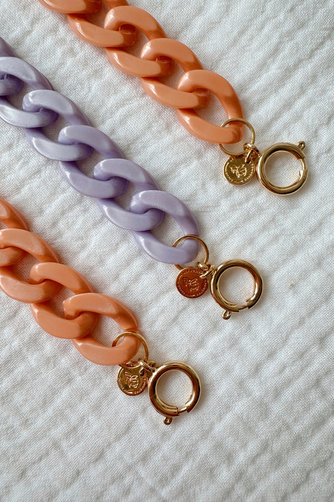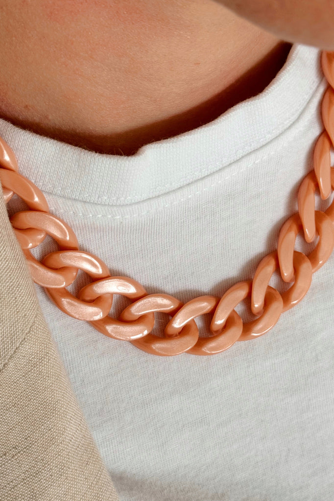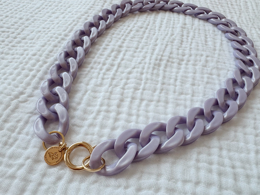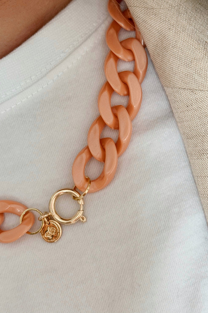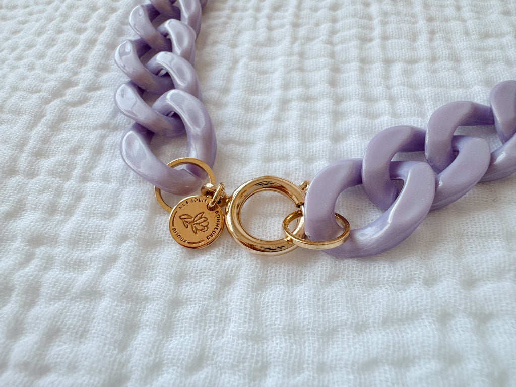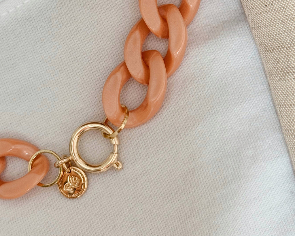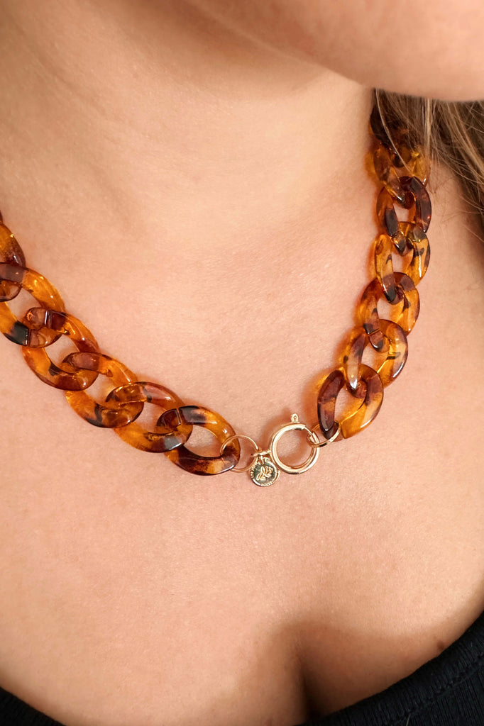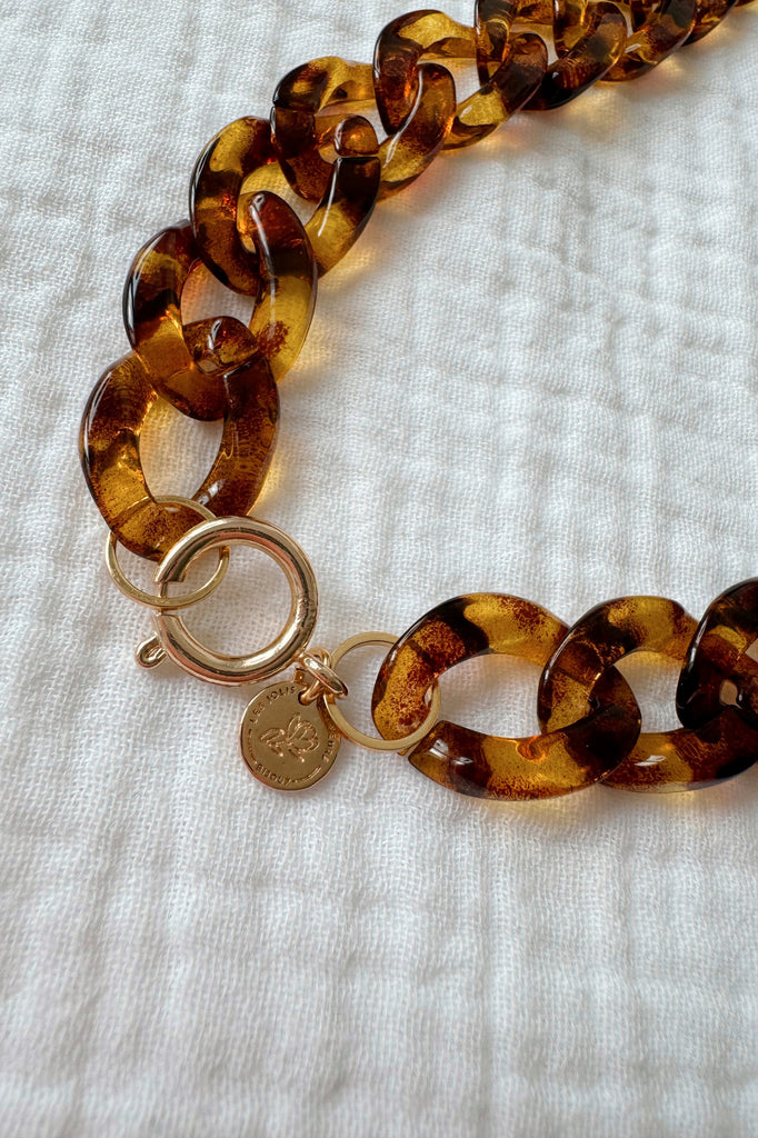 Collier de 45cm composé de maillons en acétate de 16mm x 23mm, fermé avec fermoir en laiton doré à l'or fin et orné d'une médaille Les Jolis Bonheurs plaqué or.