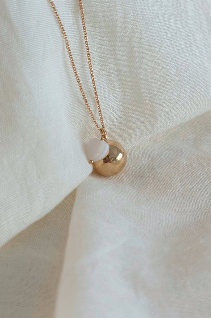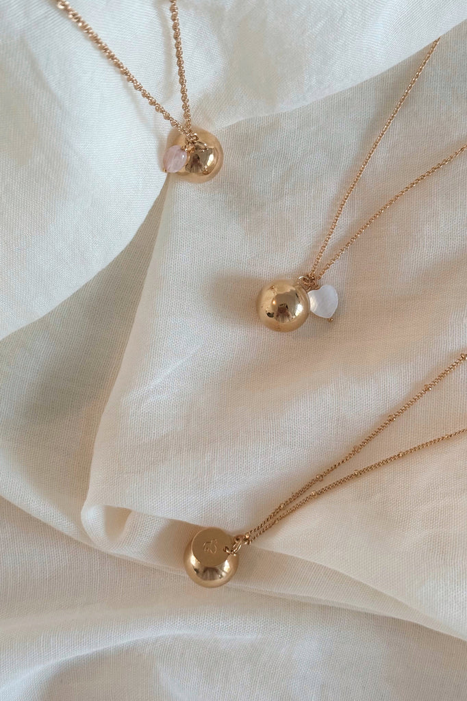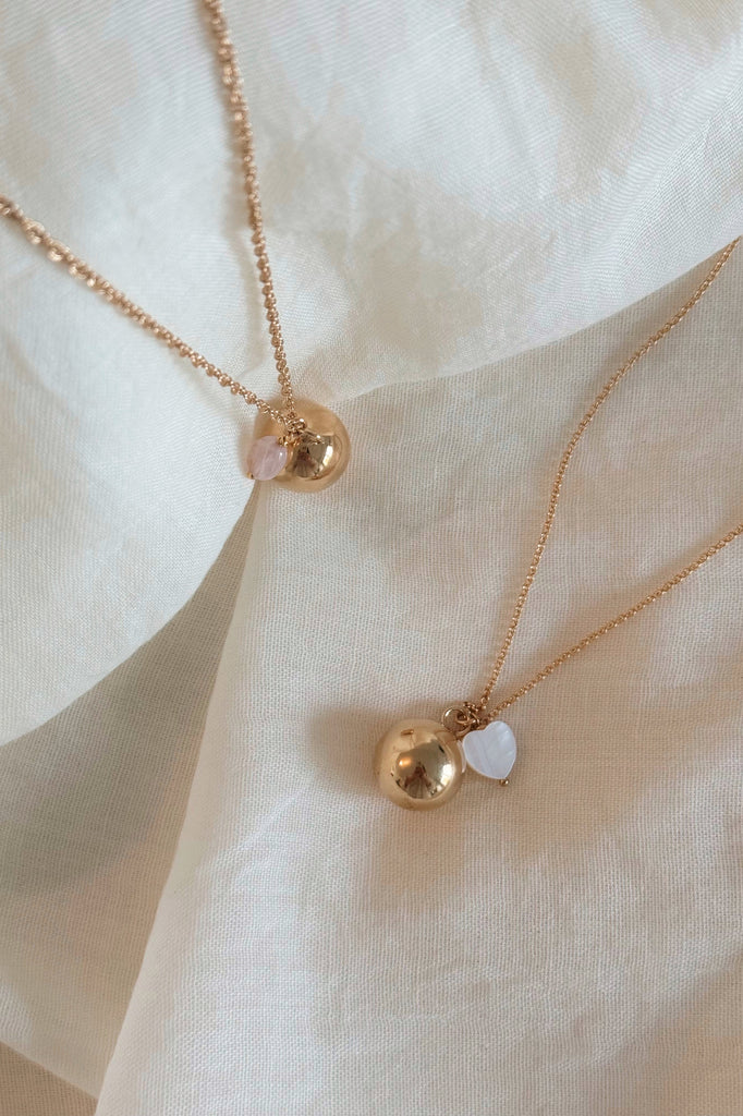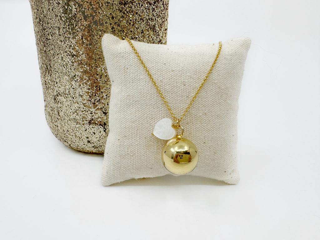 Bola de grossesse de 105cm (ajustable à 115cm) composé d'une chaine à maillons fins, d'un pendentif "bola" de 15 mm et d'un charm's en nacre blanche à sélectionner dans le menu déroulant.