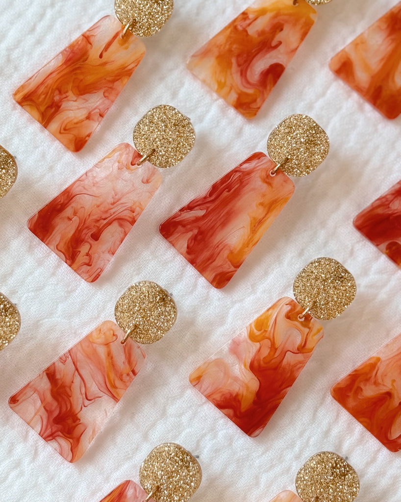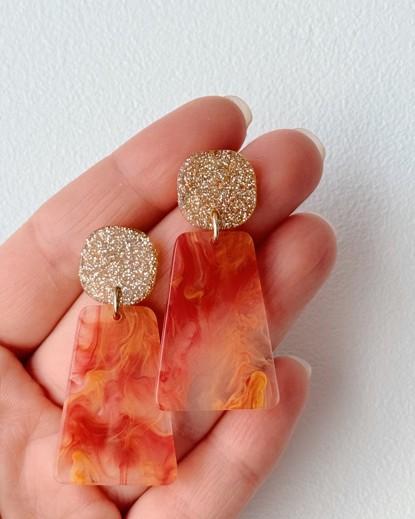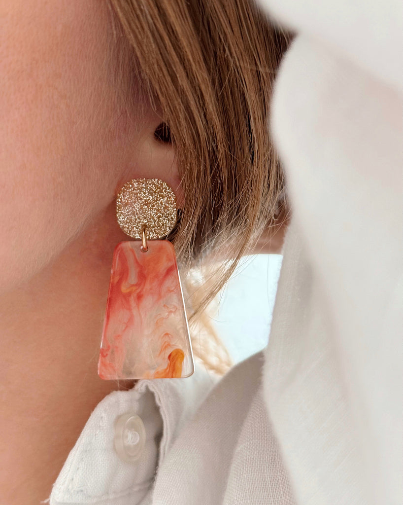Boucles d'oreilles avec puce d'oreille de 15mm de forme de carré arrondi en acétate pailleté doré et pendentif trapèze de 32mm en acétate translucide rose/rouge orangé.