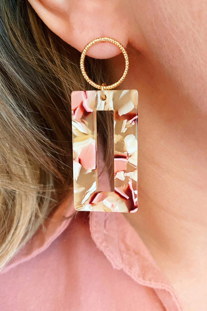 Boucles d'oreilles avec puce d'oreille en cercle de 20mm de diamètre et pendentifs en acétate transparents avec inclusions rosées et jaunes de 40mm de long et 22mm de large.