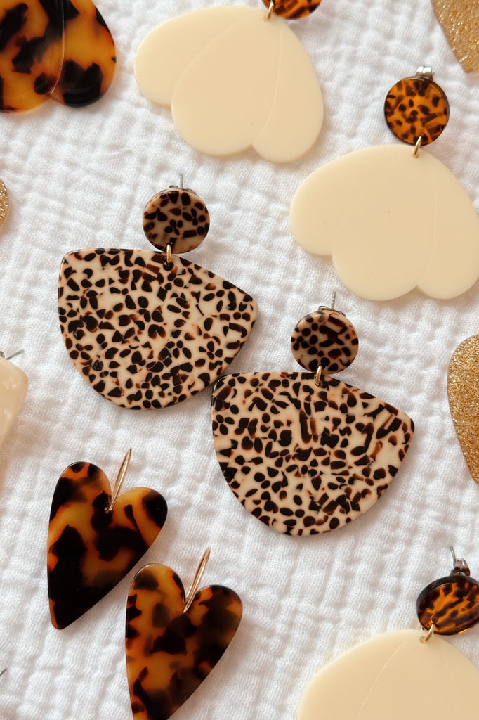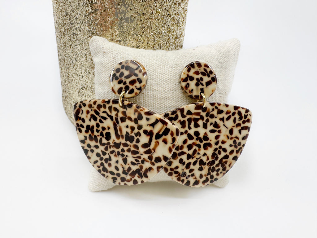 Boucles d'oreilles avec puce d'oreille de 15mm de diamètre et pendentif en acétate beige tacheté de 36 x 44mm.