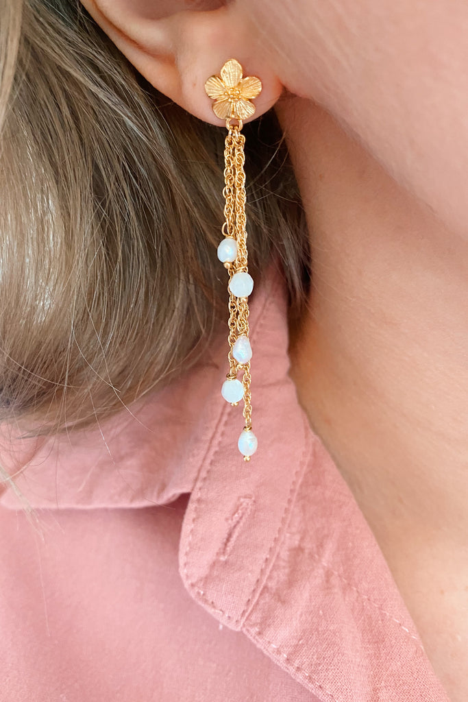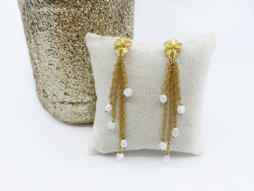 Boucles d'oreilles avec puce d'oreille fleur, agrémentées de fils de chaines de longueurs différentes, avec chacun une nacre ou une perle d'eau douce blanche.
