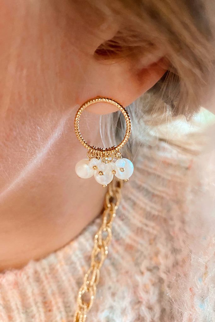 Boucles d'oreilles avec anneaux ciselés de 18mm de diamètre et système de tige et poussette, ornées de perles d'eau douces et de pierres de lune.