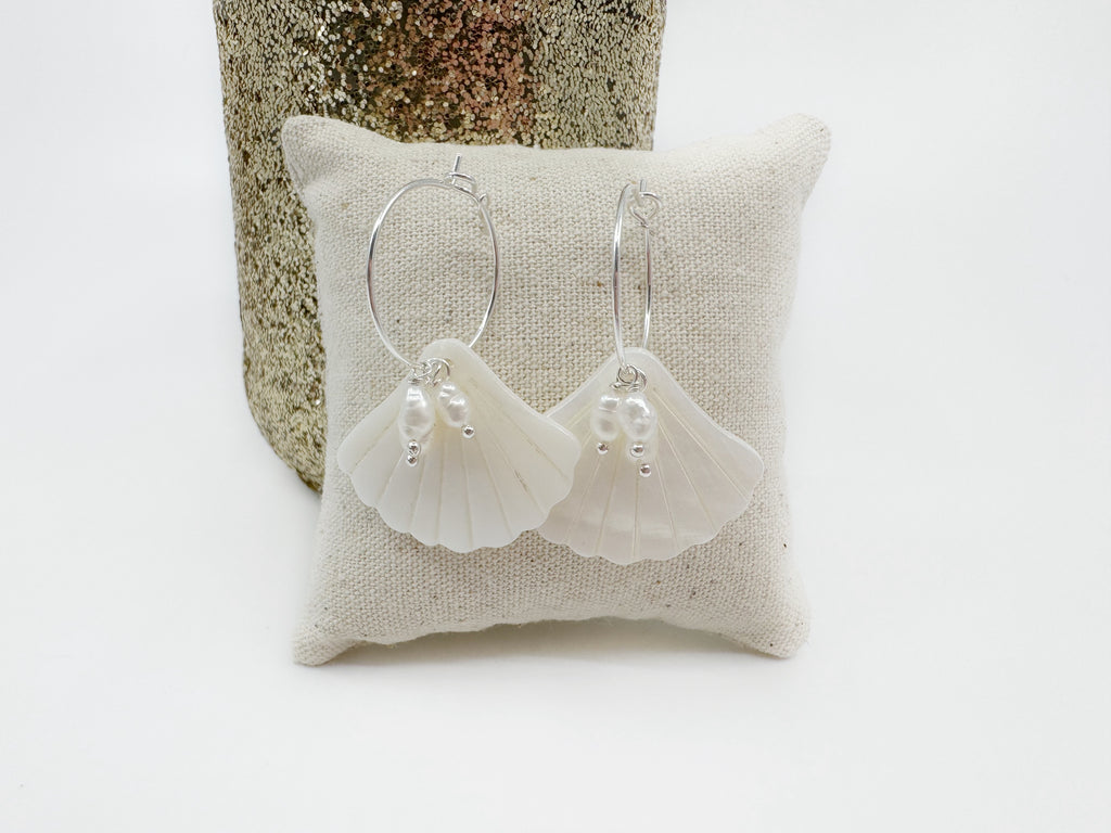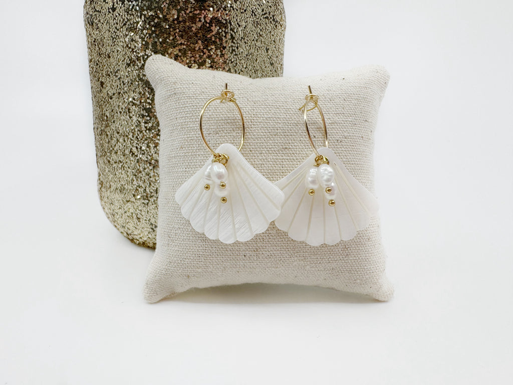 Boucles d'oreilles avec créole de 15mm (20mm pour la version argentée) avec pendentif en nacre blanche en forme de coquillage, et 3 perles d'eau douce blanches.