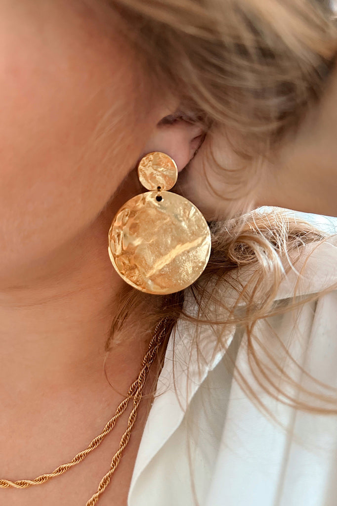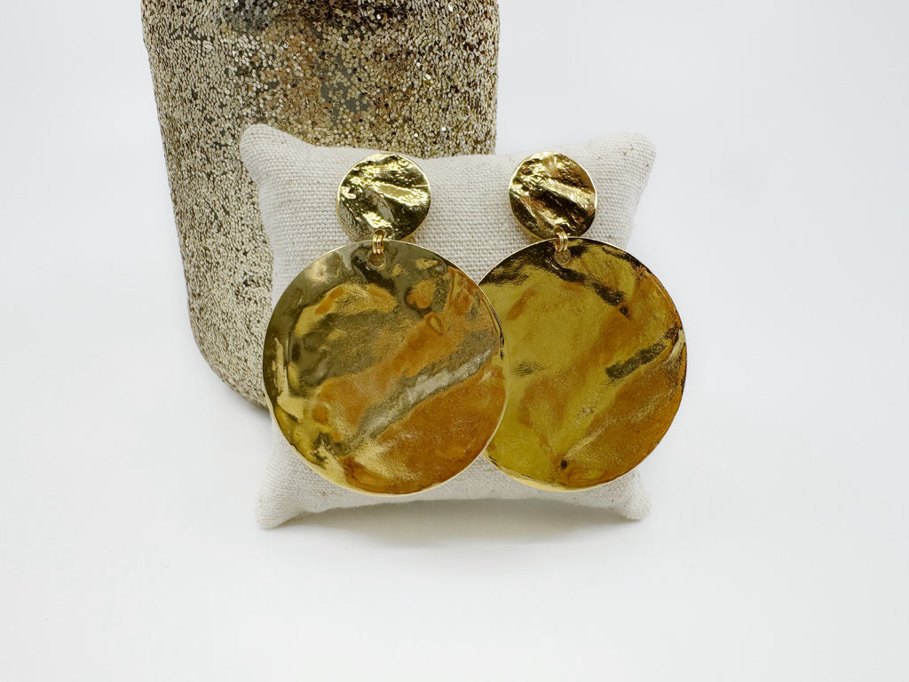 Boucles d'oreilles avec système de tige et poussette chacune composée d'une puce martelée de 15mm de diamètre et d'un pendentif de 40mm de diamètre, reliés entre eux par un double anneau.