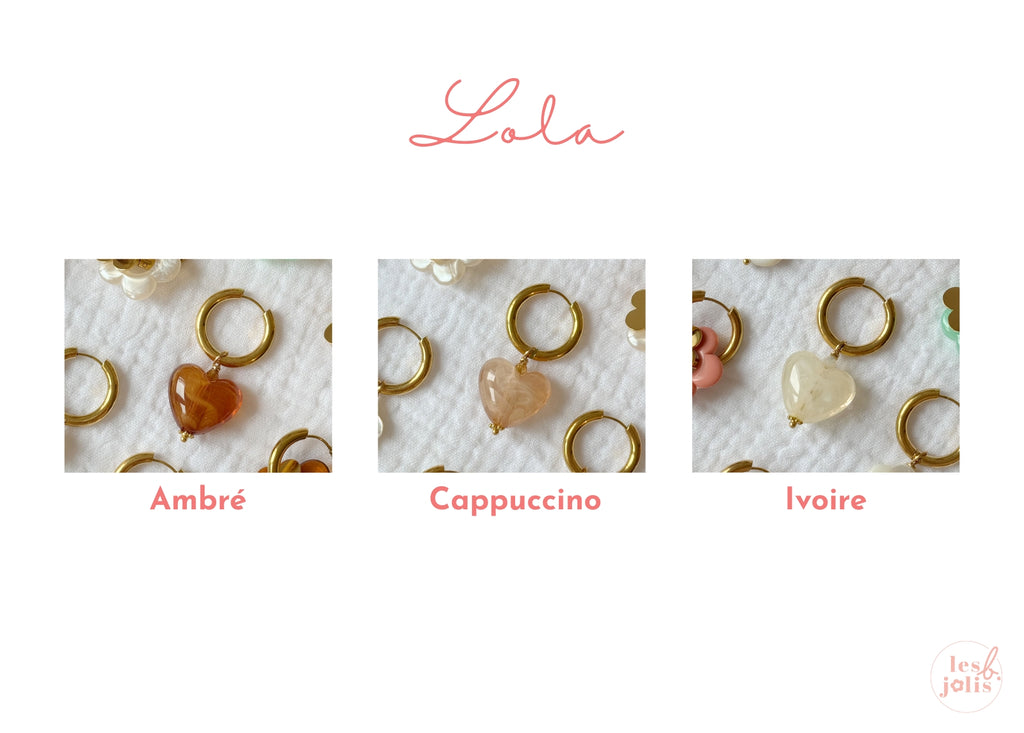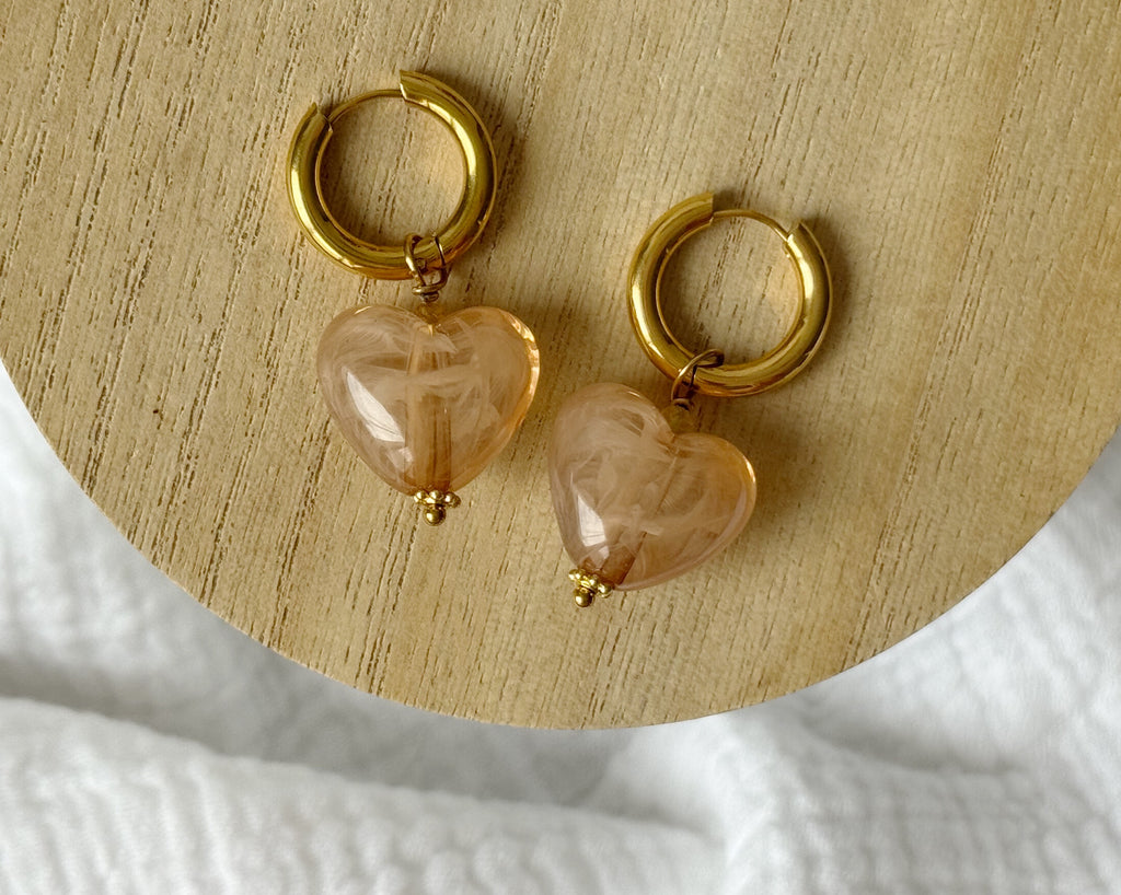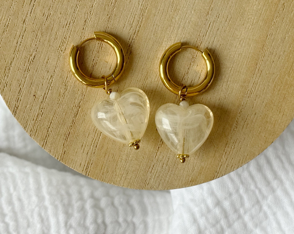 Boucles d'oreilles composées d'une créole en acier inoxydable de 18 mm de diamètre et d'un pendentif en forme de cœur en acétate. 3 coloris à choisir dans le menu déroulant.