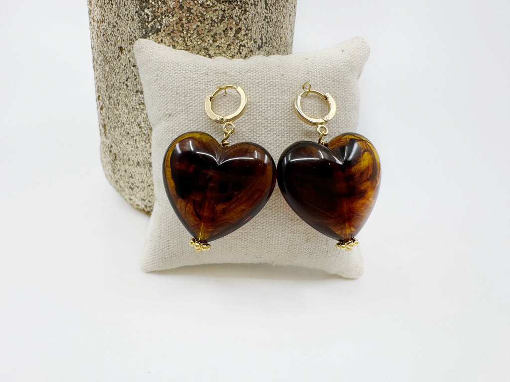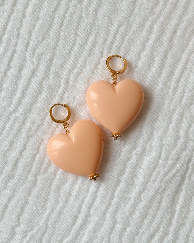 Boucles d'oreilles composées d'une dormeuse en plaqué or et d'un pendentif en cœur en résine de 2,5cm, posé sur une perle fleur en laiton doré.