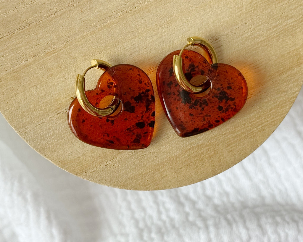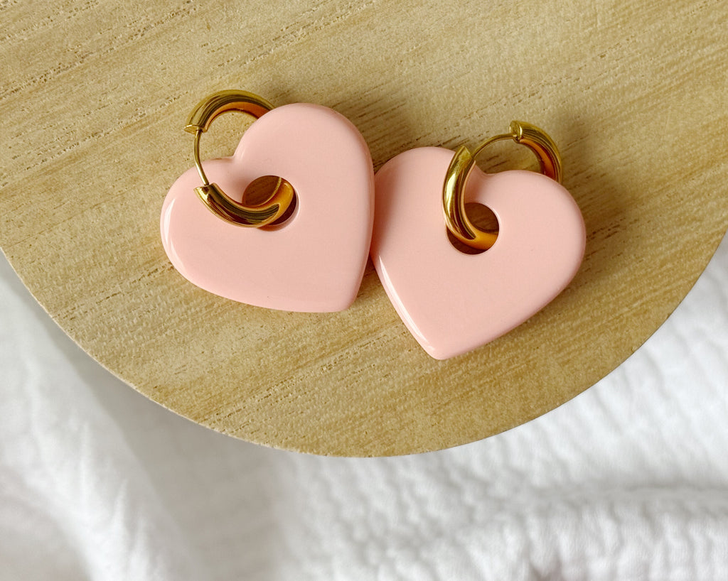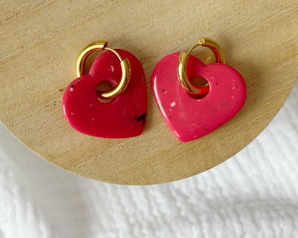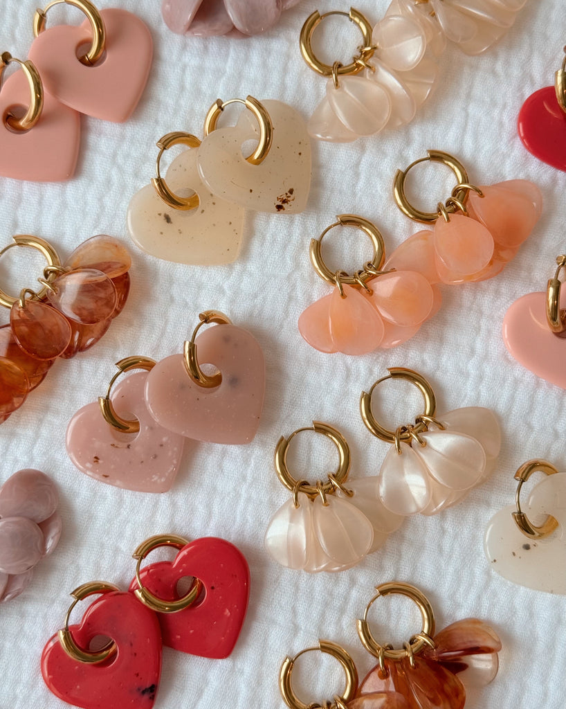Boucles d'oreilles composées d'une créole en acier inoxydable de 18 mm de diamètre, et d'un pendentif en acétate en forme de cœur. 5 coloris à choisir dans le menu déroulant.