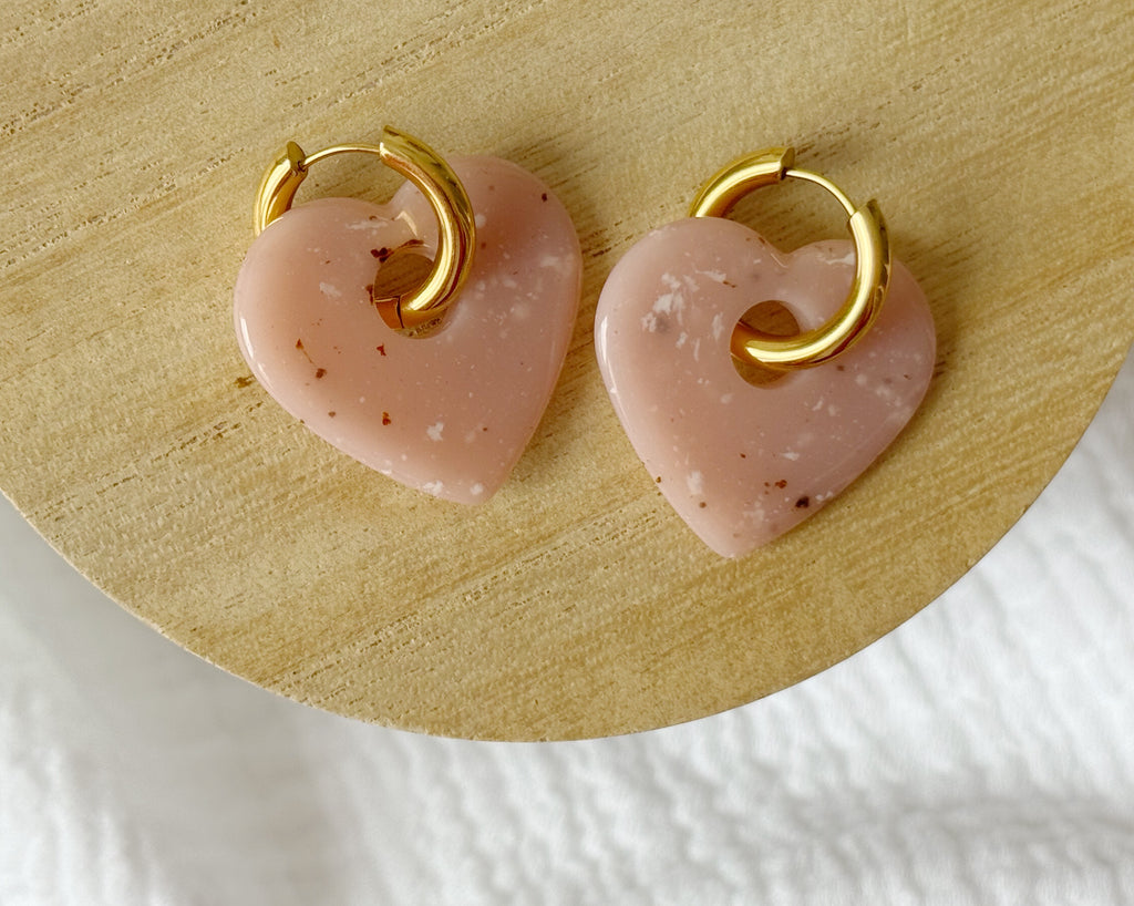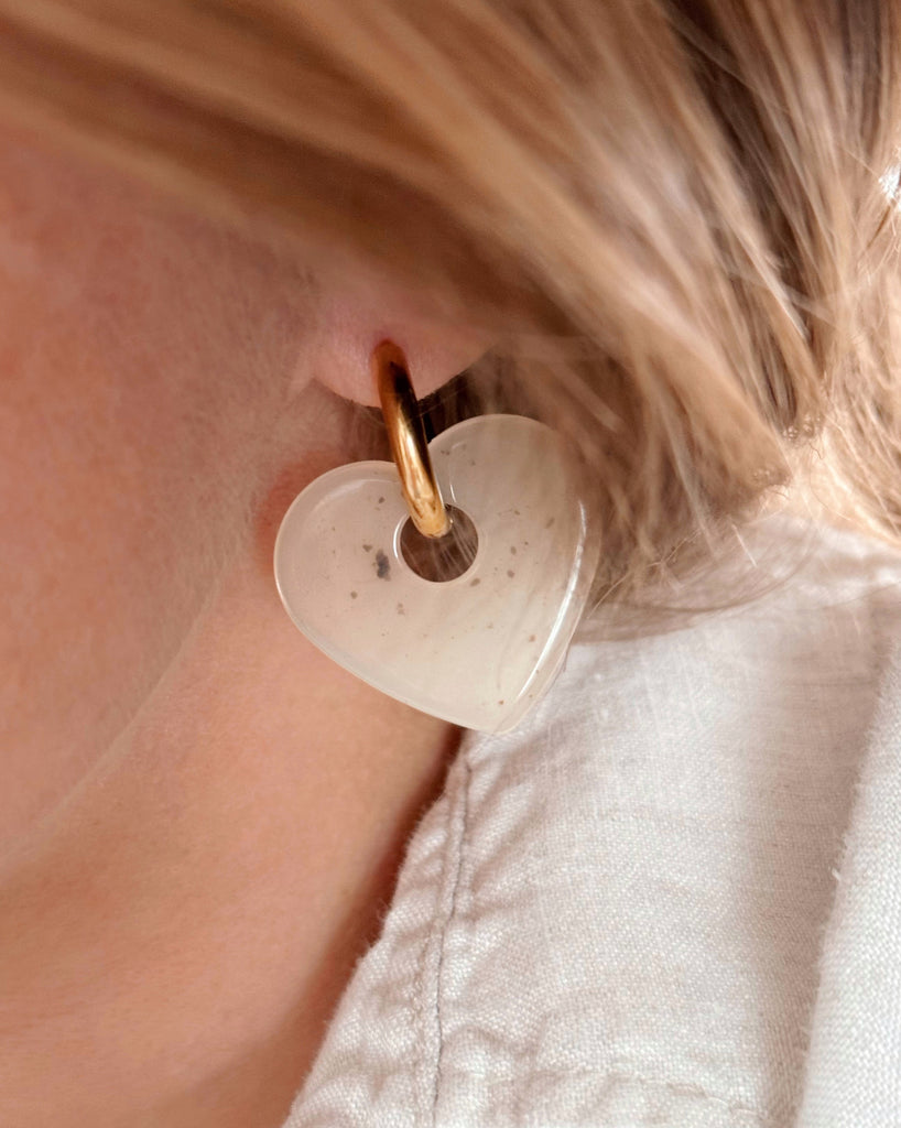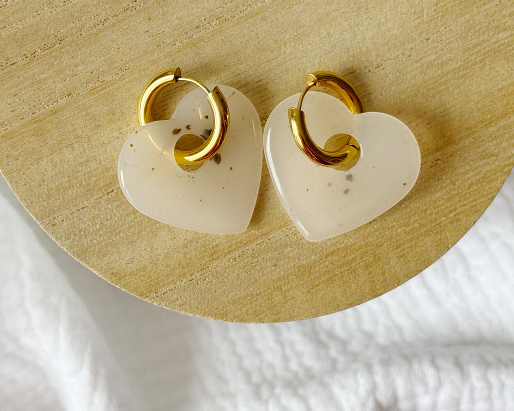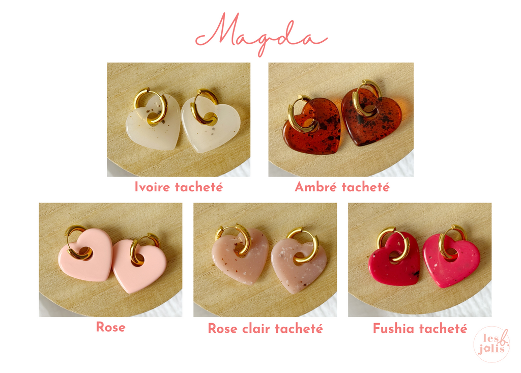 Boucles d'oreilles composées d'une créole en acier inoxydable de 18 mm de diamètre, et d'un pendentif en acétate en forme de cœur. 5 coloris à choisir dans le menu déroulant.