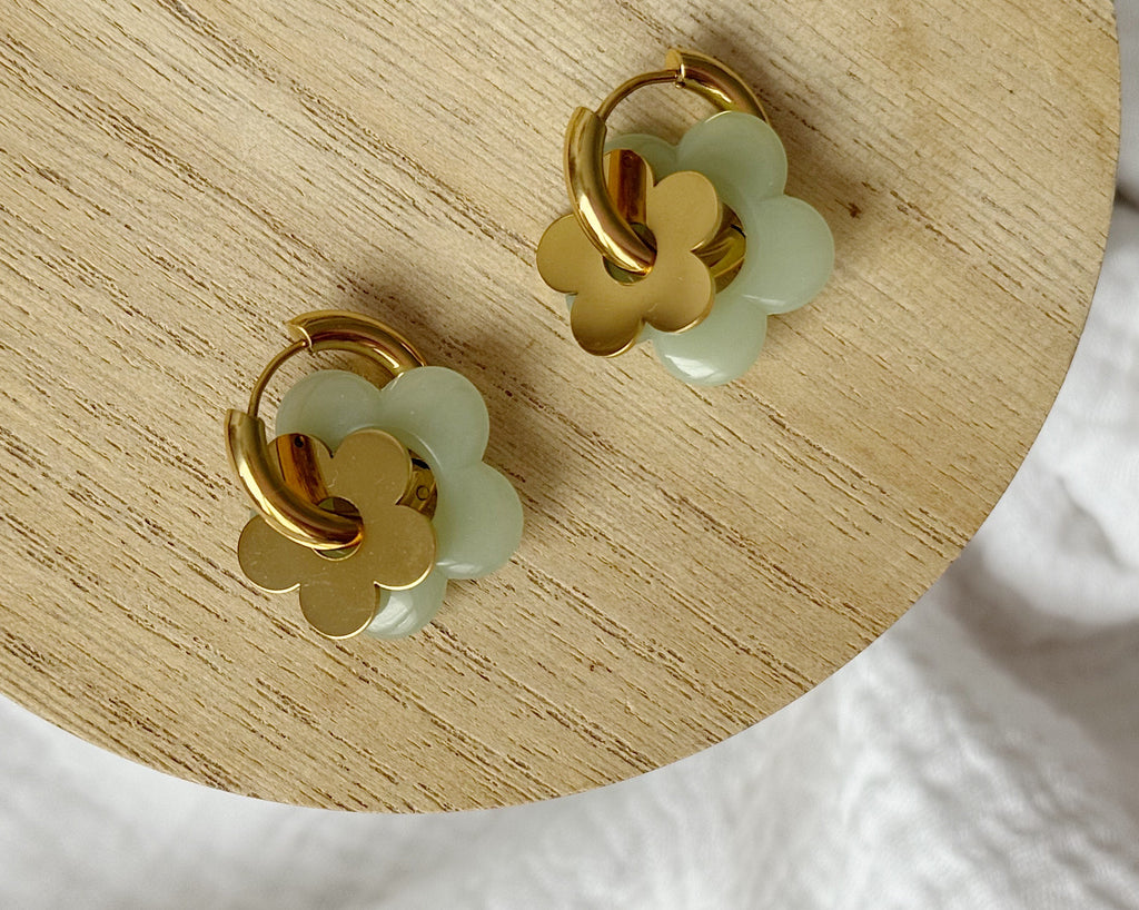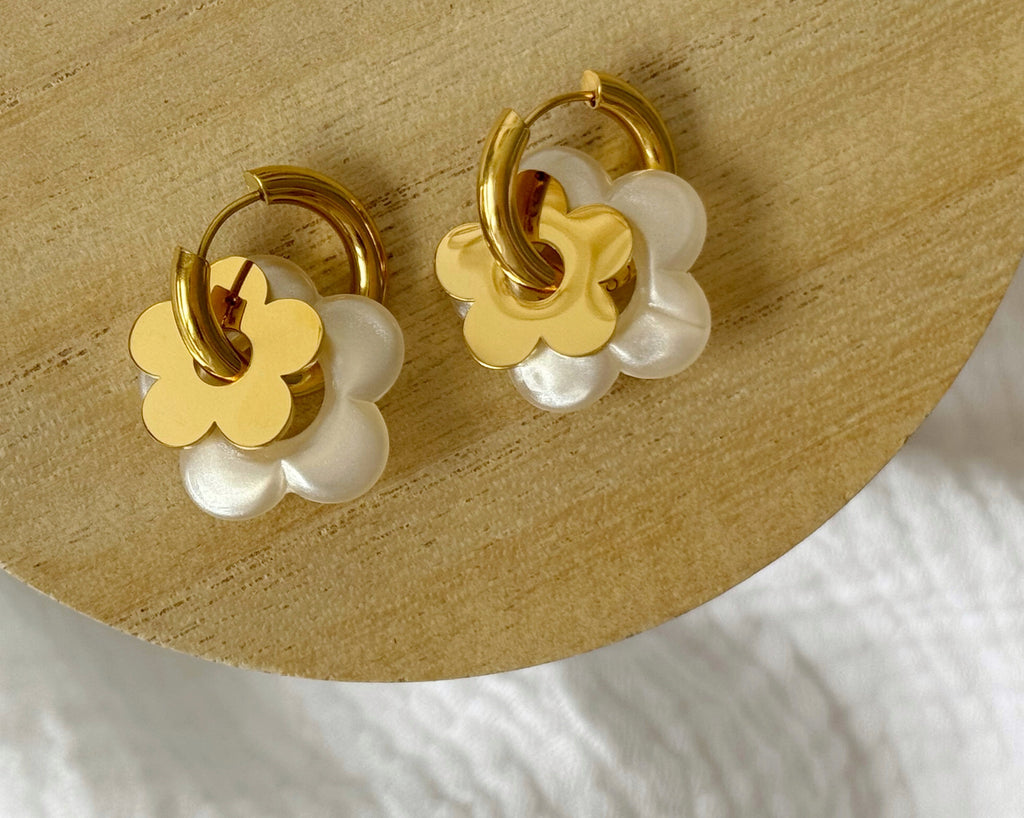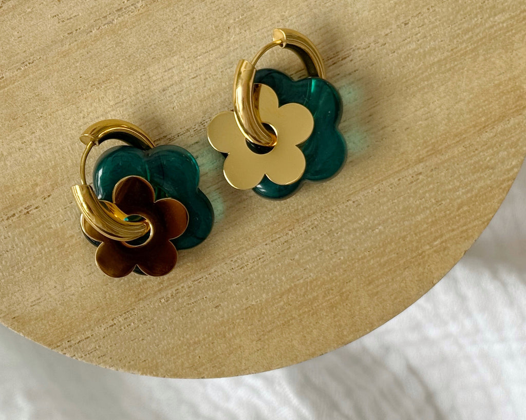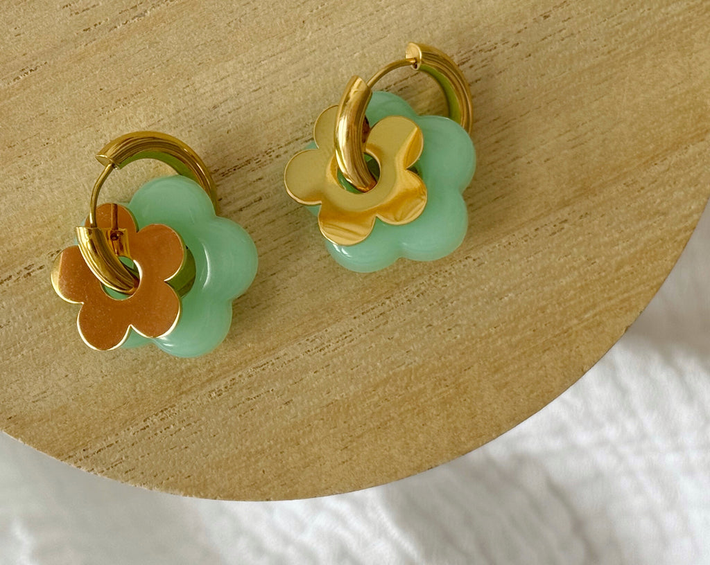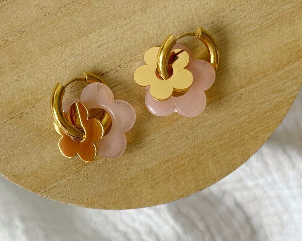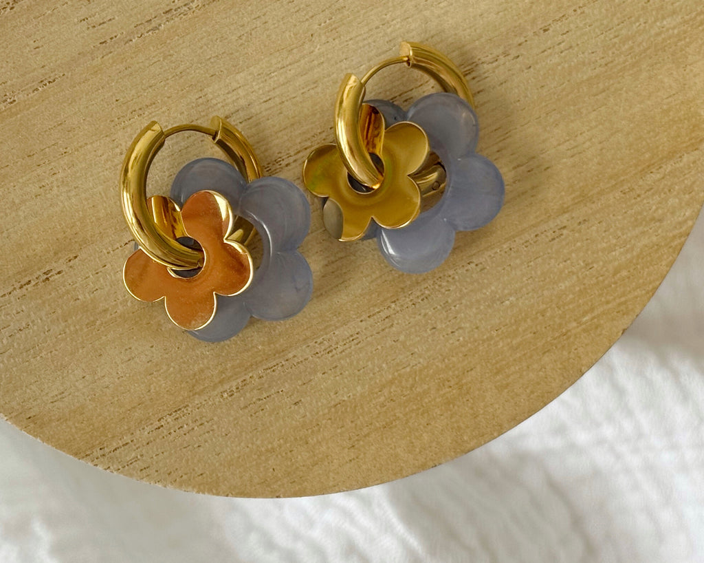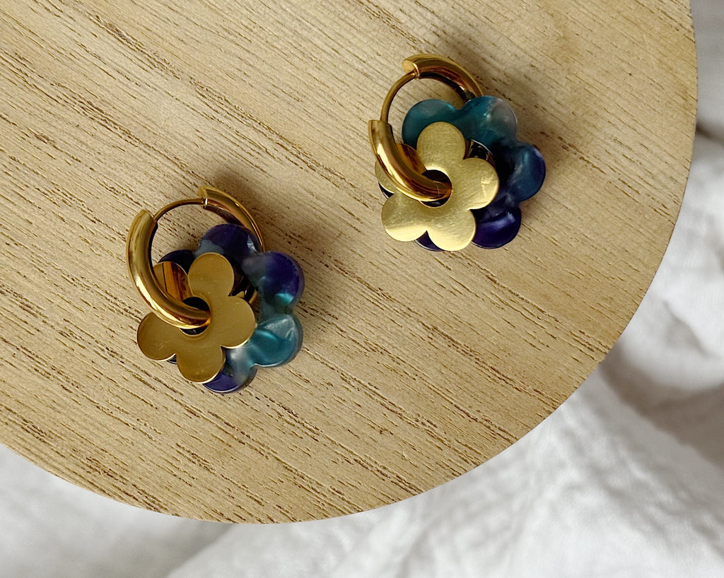 Boucles d'oreilles composées d'une créole en acier inoxydable de 18 mm de diamètre, d'une paire de fleur en acier inoxydable doré de 15 mm et d'une paire de fleur en acétate de 21 mm. 15 coloris au choix à sélectionner dans le menu déroulant.