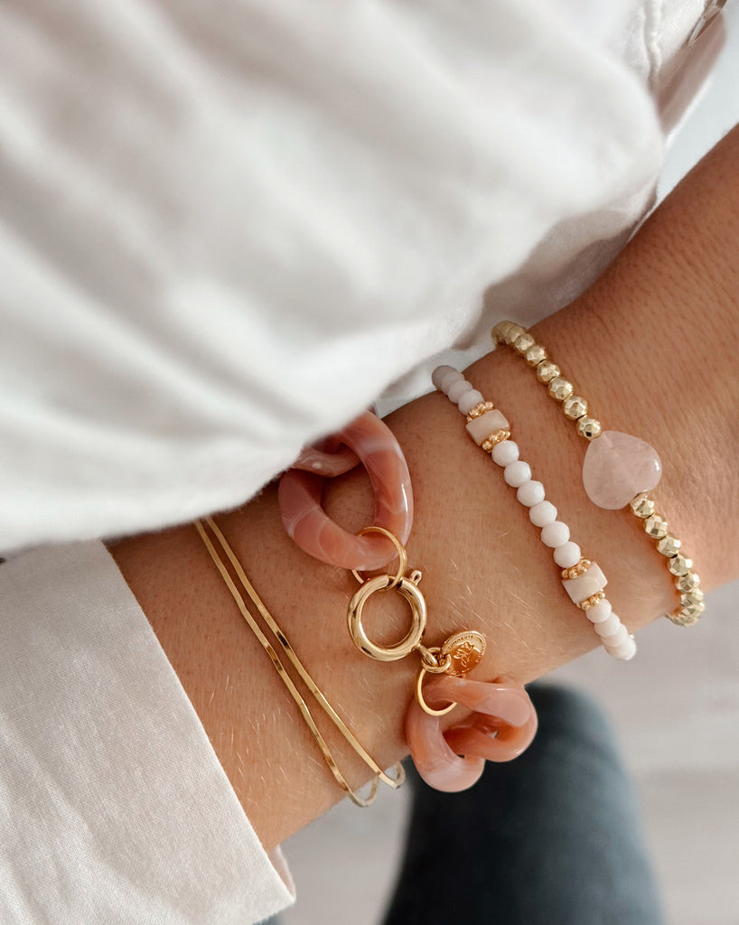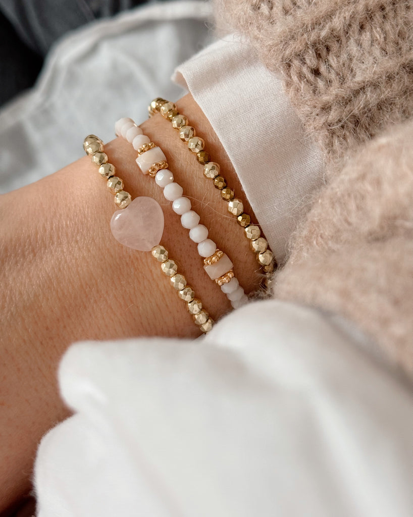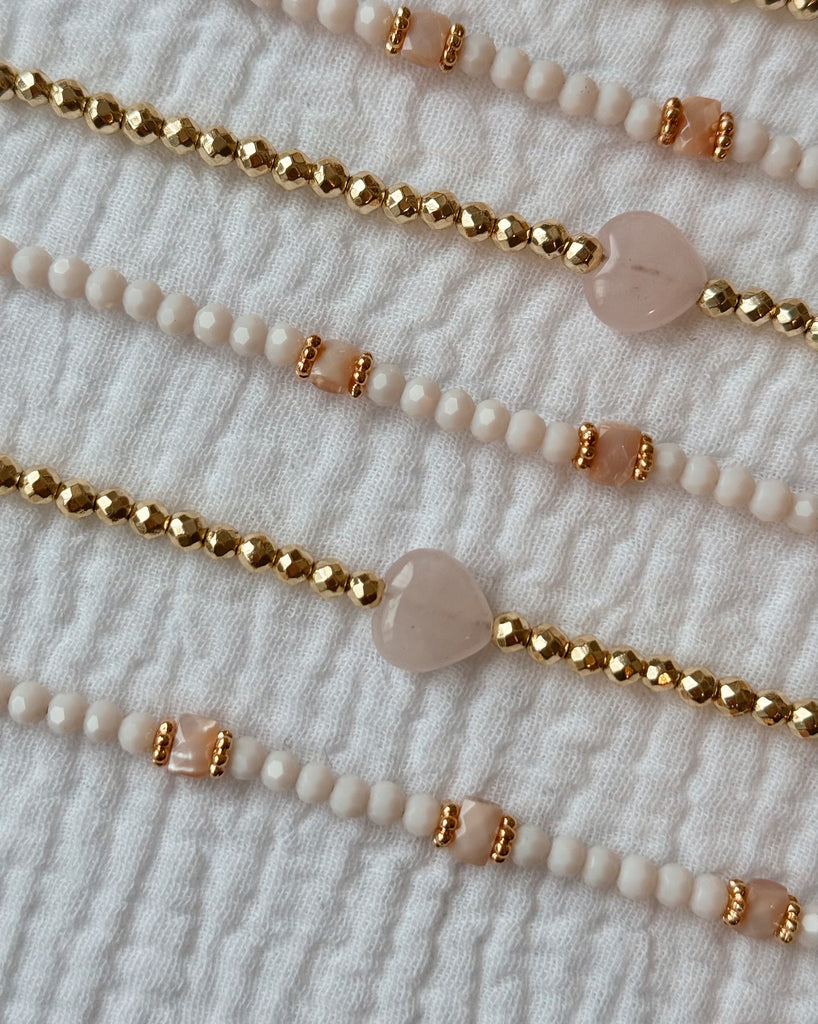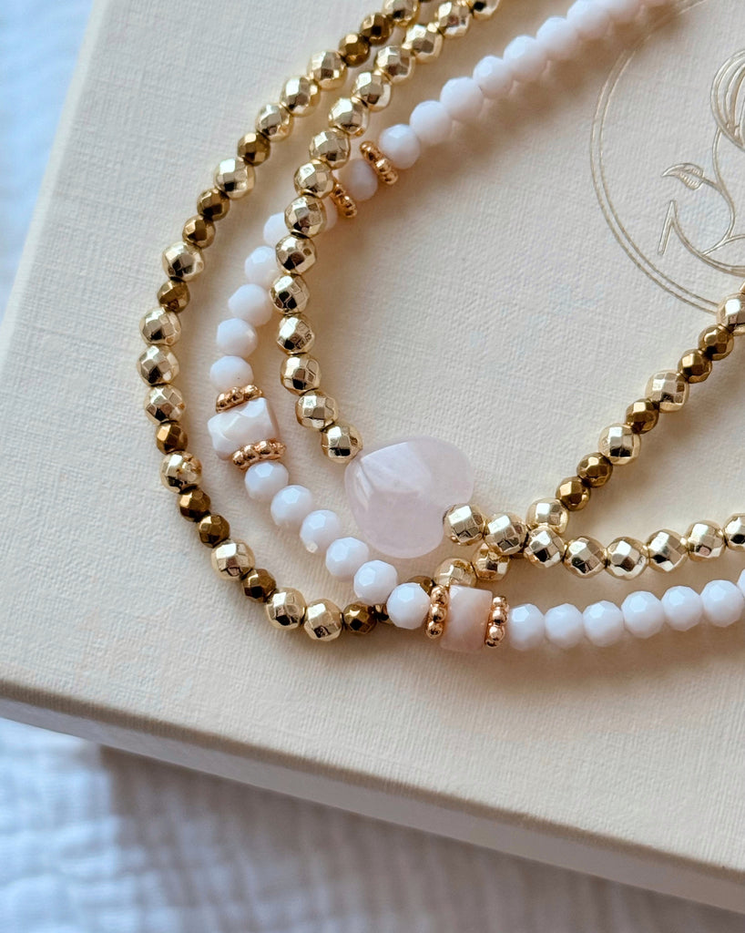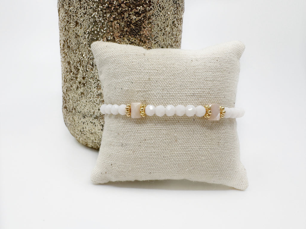 Bracelet réglable sur fil de jade beige orné de cristal facettés de 4 mm de diamètre, de perle en laiton doré à l'or fin et de nacres rectangulaires rosées facettées.