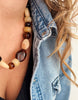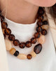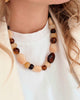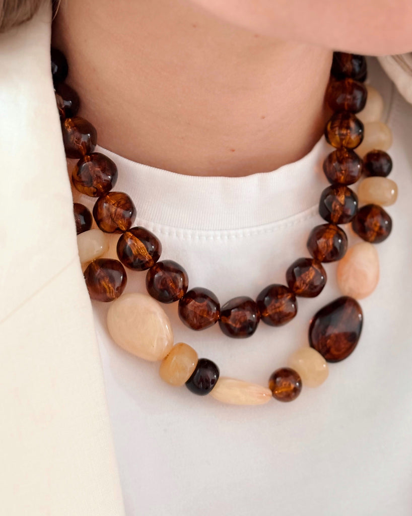 Collier ajustable de 43/48cm avec chaine fine ornée de perles en acétate de différentes tailles et coloris dans les tons ivoire et ambré. Petite pierre de tourmaline sur le fermoir.