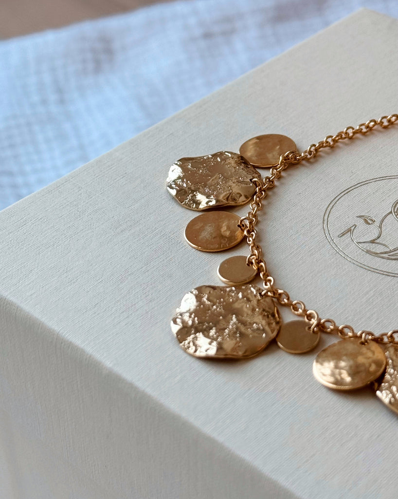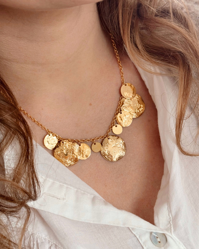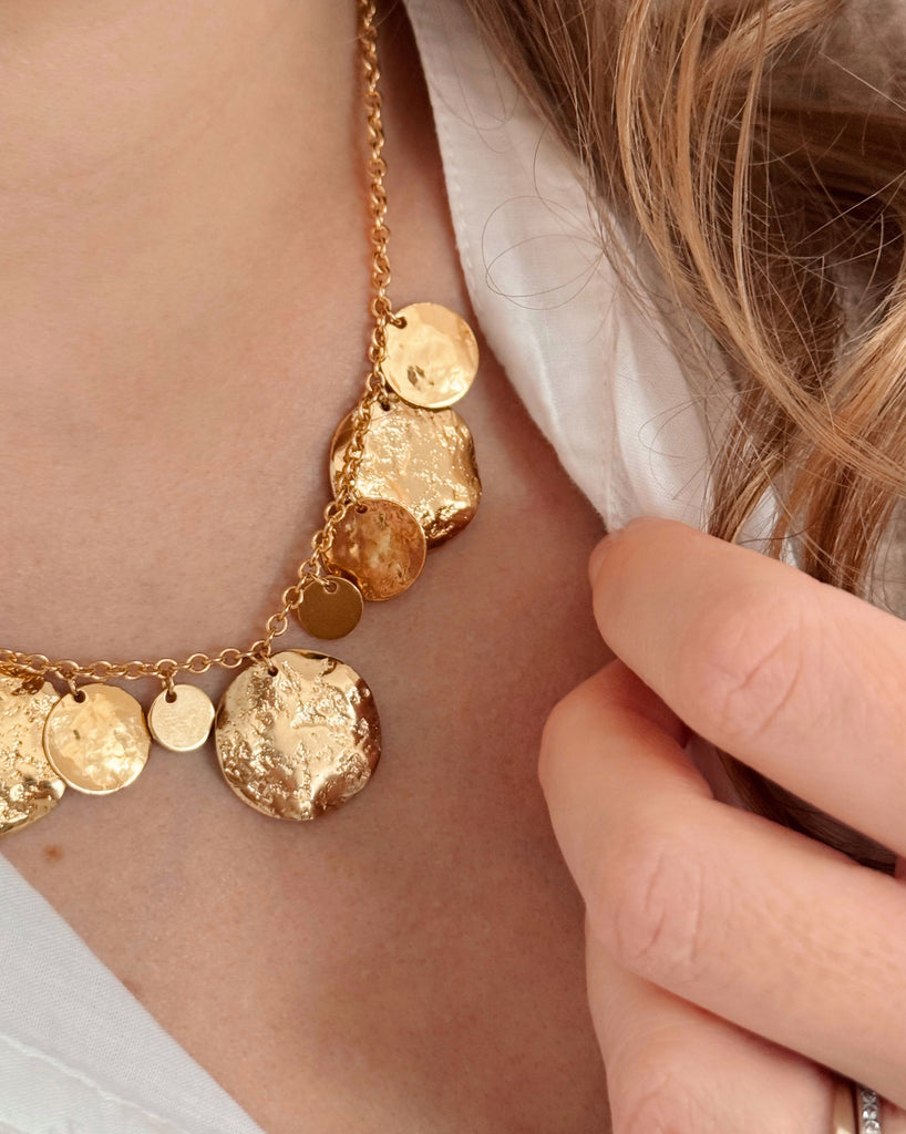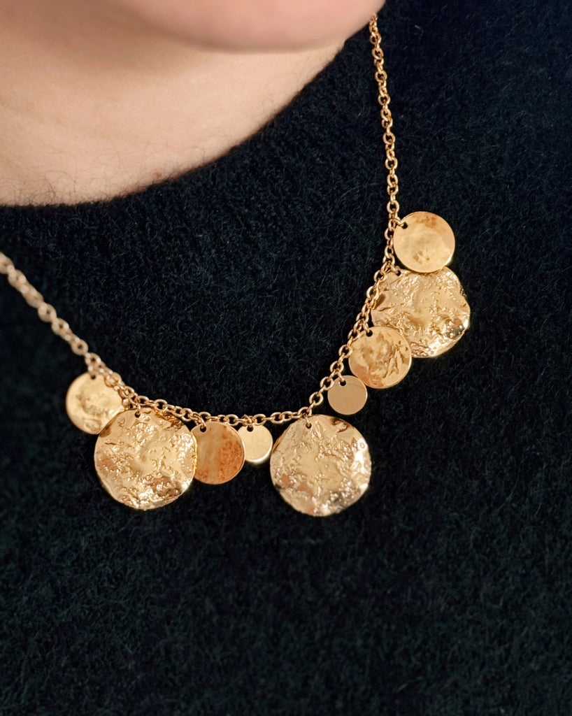 Collier avec chaîne aux maillons arrondis de 40cm, orné de médailles martelés et non martelées de différentes tailles