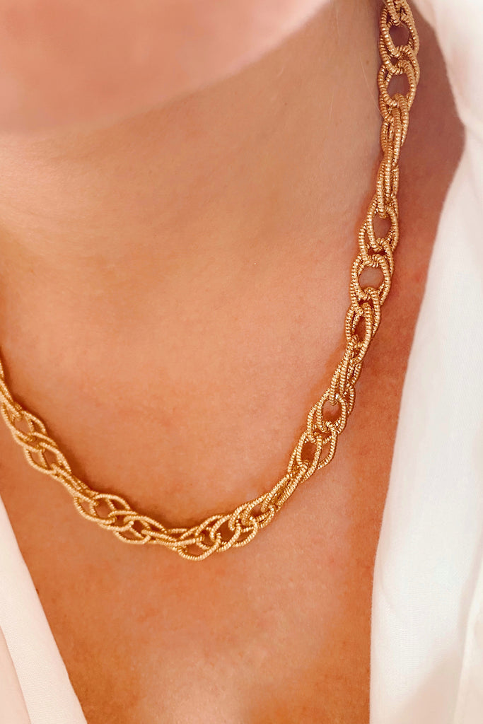 Collier de 45 cm avec chaîne torsadée composée de maillons entrelacés et ciselés. Fermoir rock à porter sur le devant, sur le côté, ou non visible comme un fermoir classique.