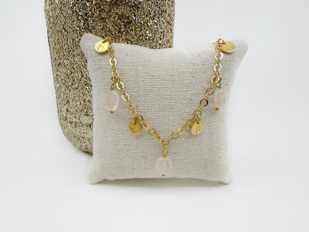 La collection HOPE c'est un collier et également une version bracelet, dédiée à la cause d'Octobre Rose. J'ai choisi pour cette collection une pierre réconfortante, pleine d'amour et de compassion, le quartz rose. C'est une pierre que j'aime d'amour, liée aux énergies du cœur, que j'utilise sur de nombreuses collections comme la collection MèreVeille. Et pour que votre bijou ne ressemble qu'à vous, qu'il porte VOTRE histoire, cette collection sera personnalisable, grâce à 4 petites médailles estampillées dans mon atelier.