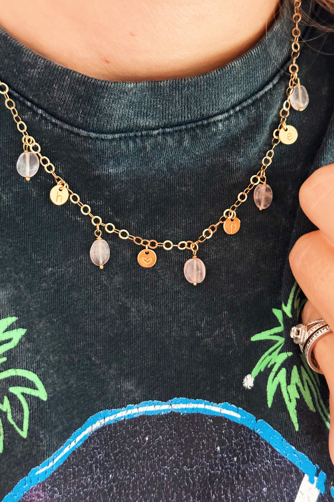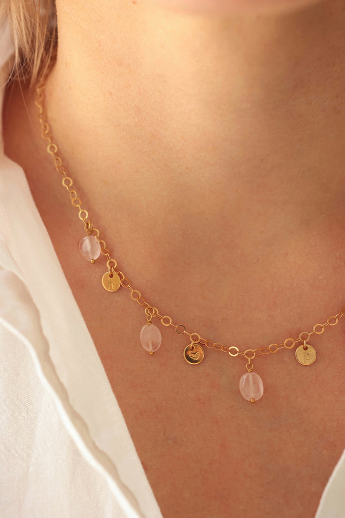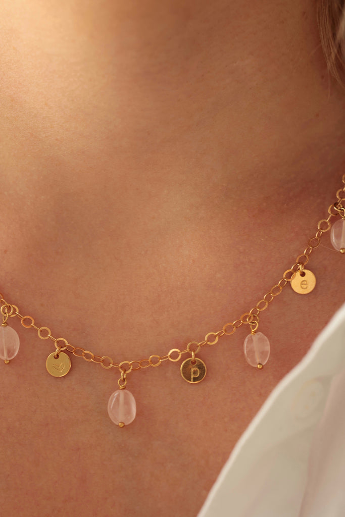 Collier ajustable de 43cm, composé d'un chaine à petits maillons ronds, orné de 5 pierres de quartz rose de forme caillou et de 4 médailles de 6mm à personnaliser. Le collier est signé avec sa médaille Les Jolis Bonheurs sur le fermoir.