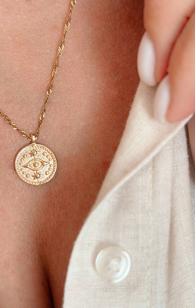 Collier avec chaîne torsadée et pendentif rond et empreintes œil.