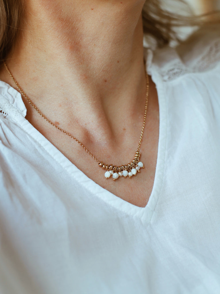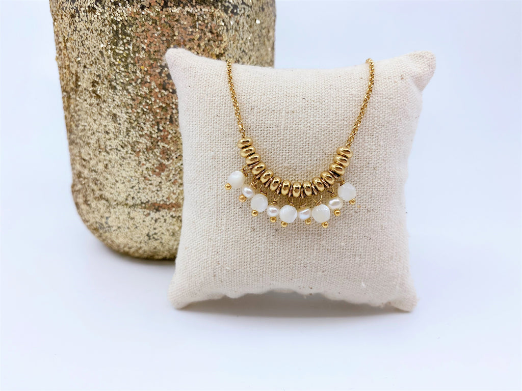 Collier avec chaîne de 42/47 cm agrémenté de perles de nacre blanche facettée, de petites perles d'eau douce blanches et de perles dorée.