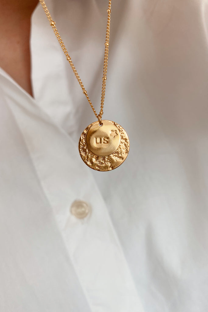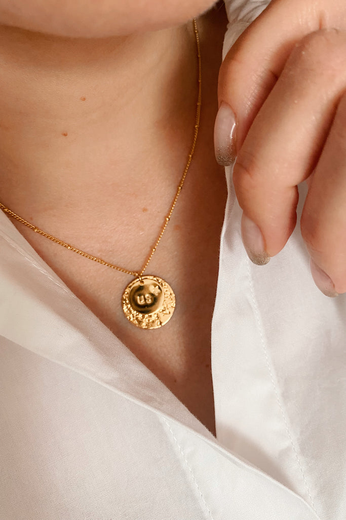 Collier avec chaîne boule orné d'une médaille martelée de 18mm et d'une médaille lisse à personnaliser. Disponible en version sautoir de 70cm ou en collier court de 45cm (à choisir dans le menu déroulant). Une pierre de lune ainsi qu'un quartz rose ornent le fermoir du bijou en référence à la femme, à l'amour. Bijou disponible en laiton doré à l'or fin uniquement.