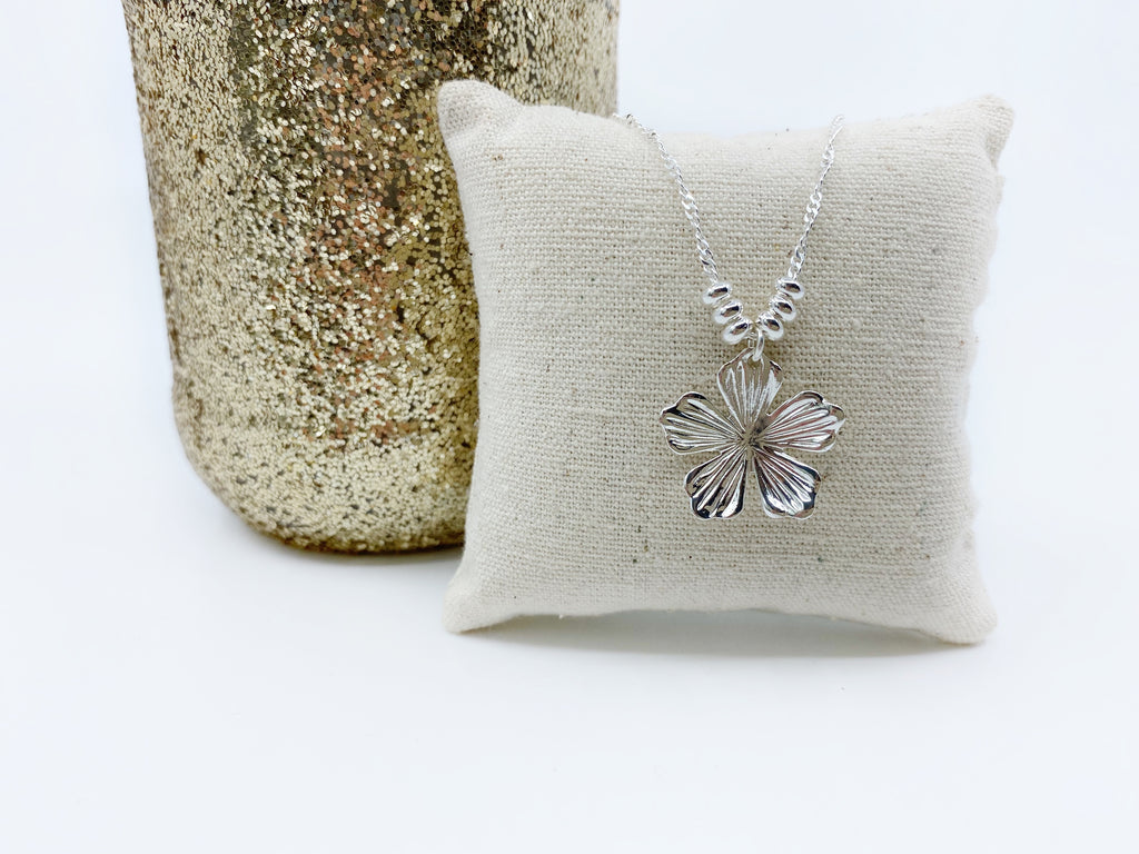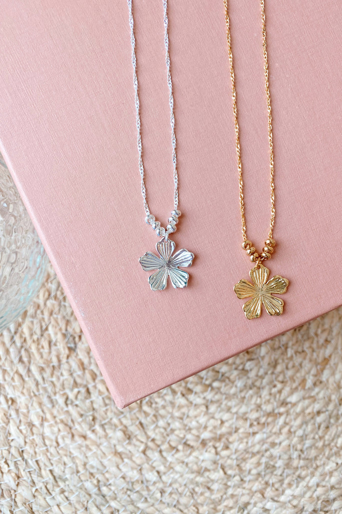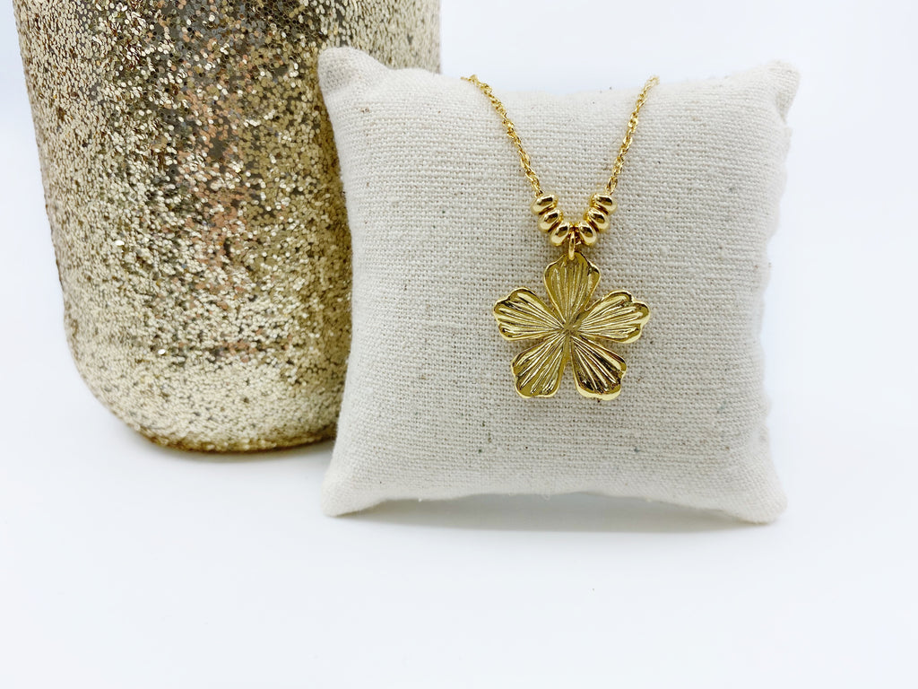Collier de 65cm avec pendentif fleur de 2cm de diamètre et petites perles en laiton, perle en nacre sur le fermoir.
