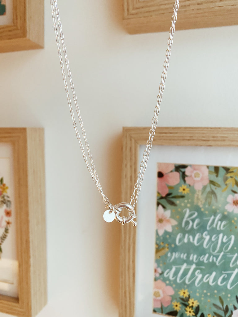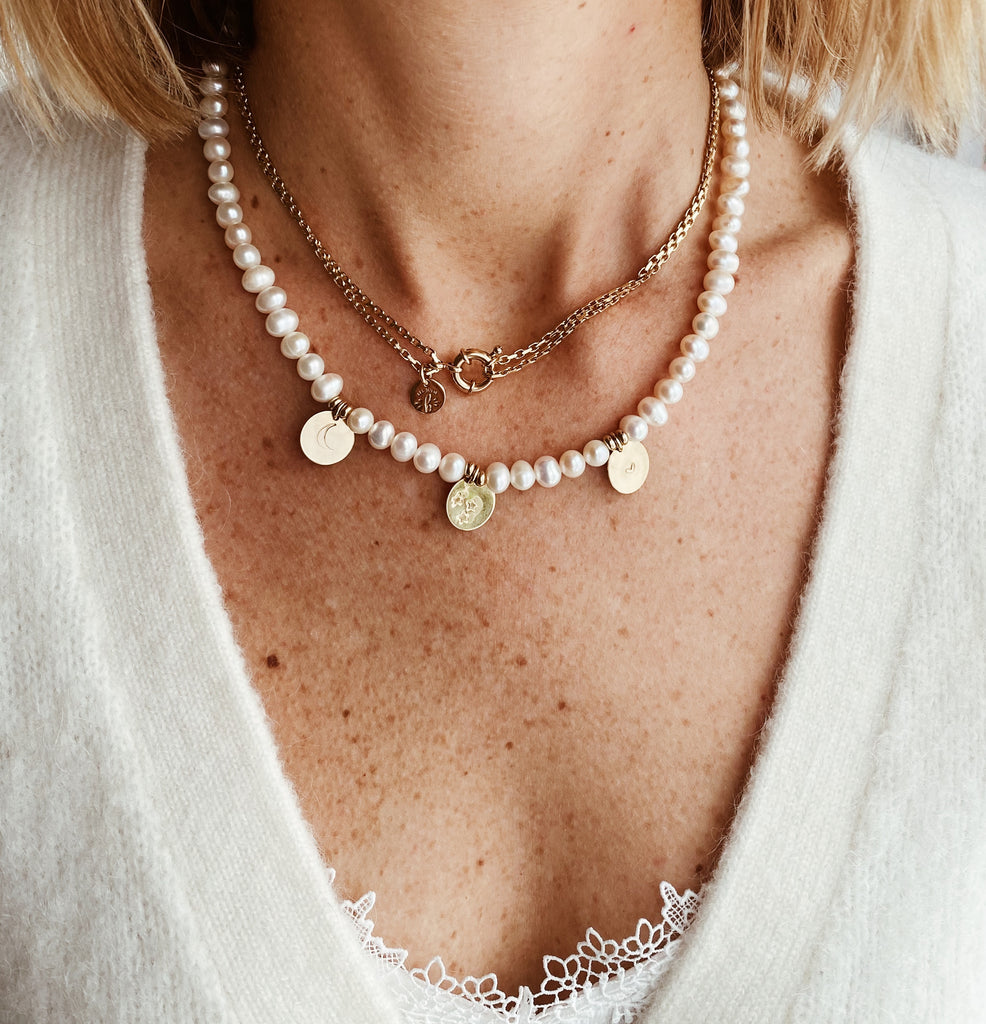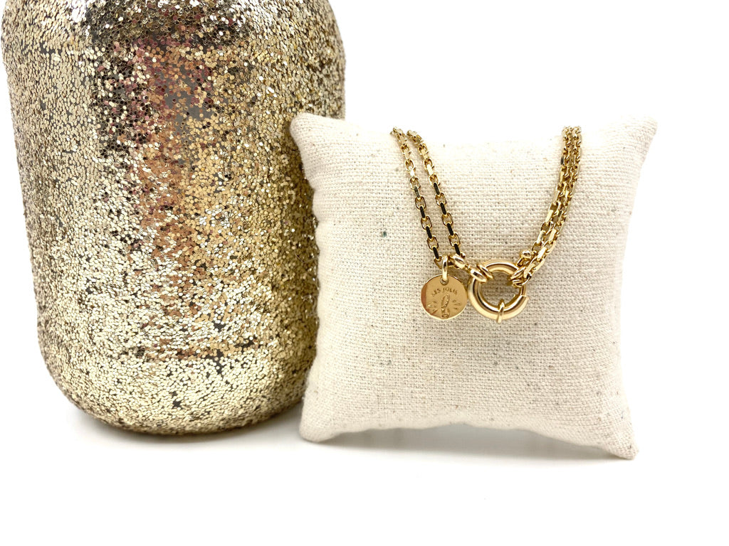 Collier avec chaîne Figaro doublée de 41 cm. Fermoir rock sur le devant et mini médaille Les Jolis Bonheurs.