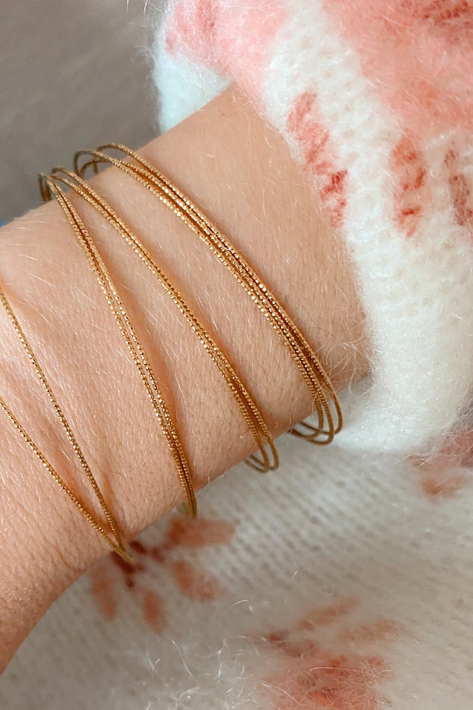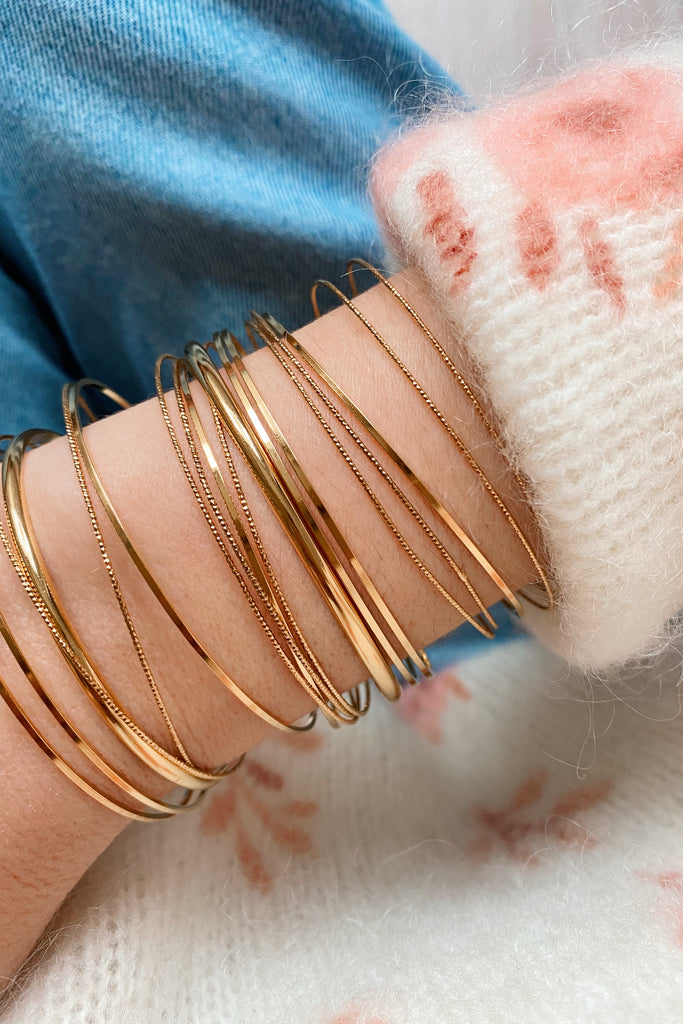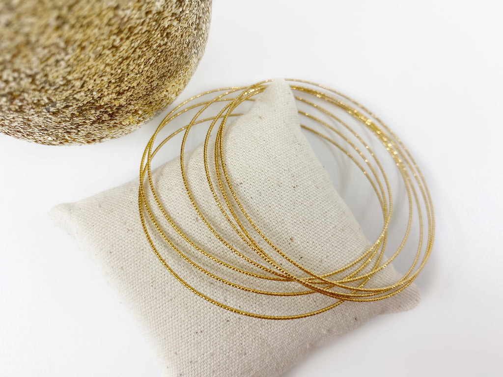 Semainier comprenant 7 bracelets joncs souples, martelés et très fins à enfiler. Chaque bracelet prendra la forme de votre de votre poignet au fil du temps, et prendra alors une forme qui lui sera propre.