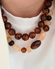Collier ajustable de 40/45cm avec chaine fine orné de perles en acétate ambré translucide de 15mm. Petite pierre de tourmaline sur le fermoir.