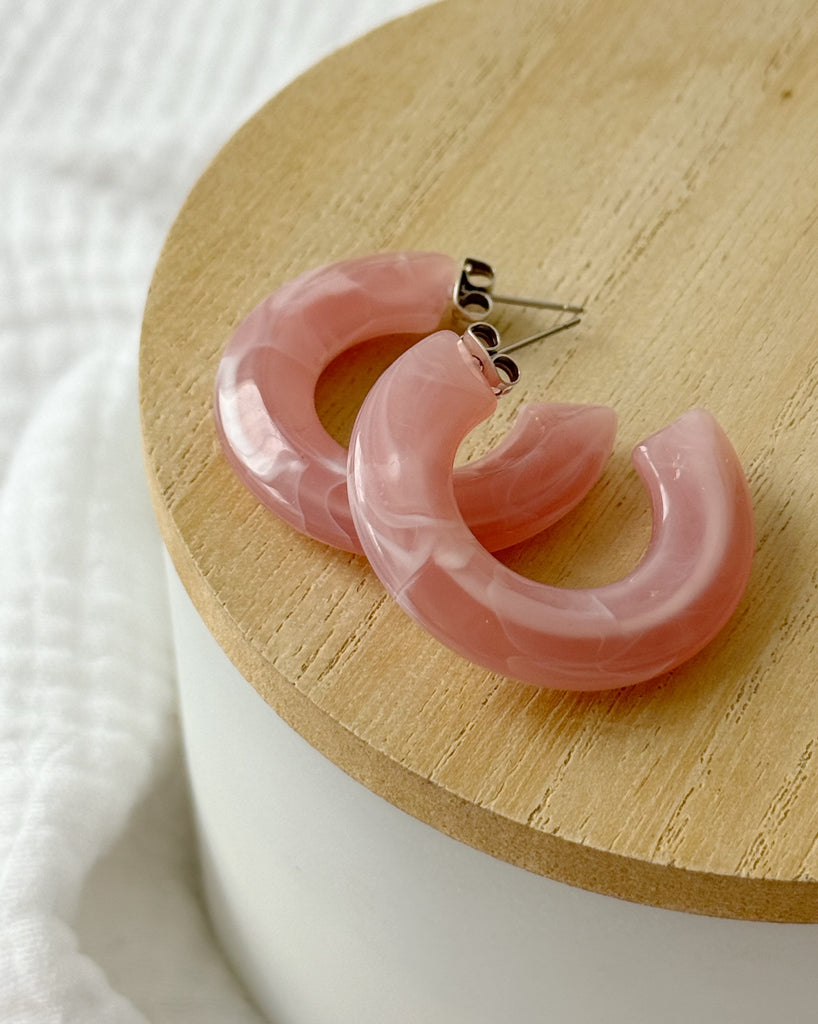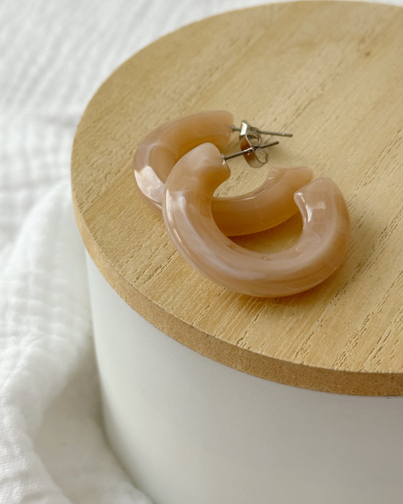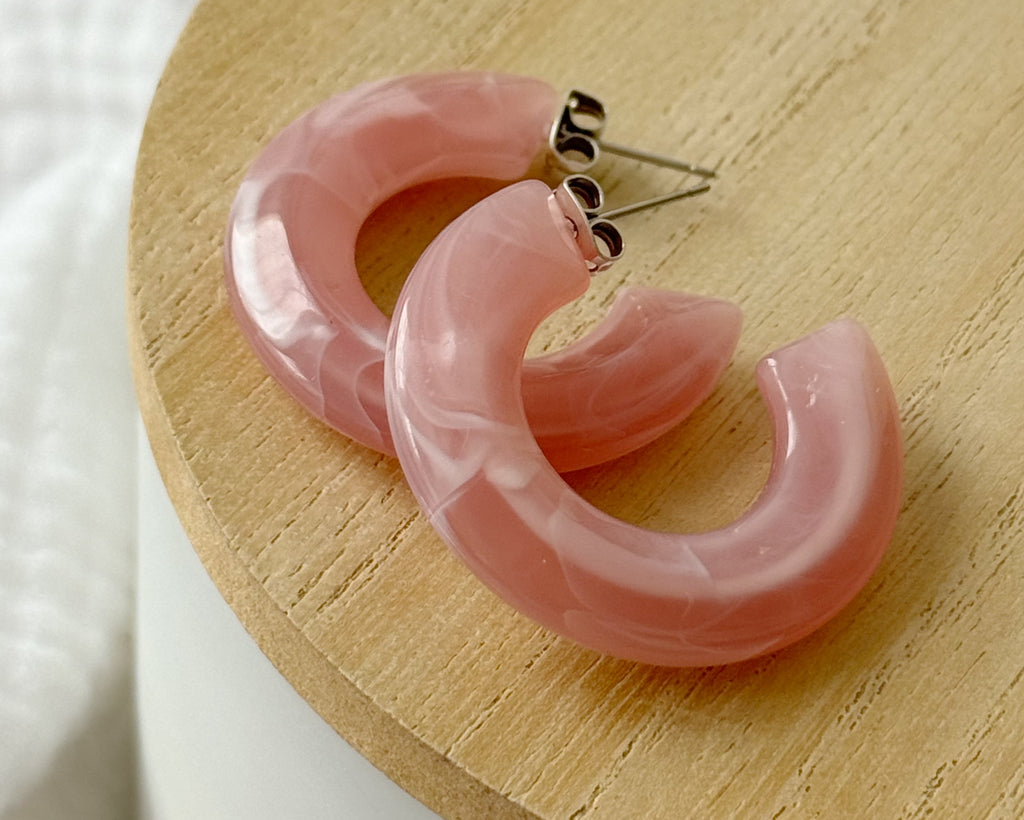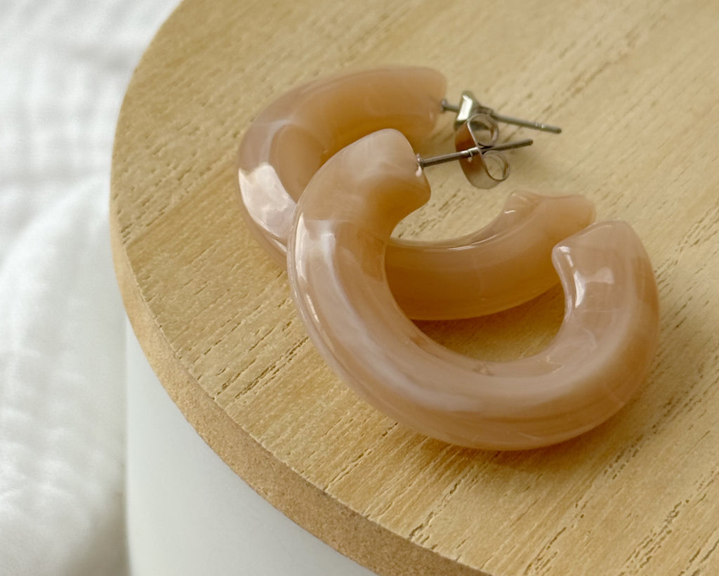 Créoles en acétate beige marbré ou rose marbré, avec tige en acier inoxydable.